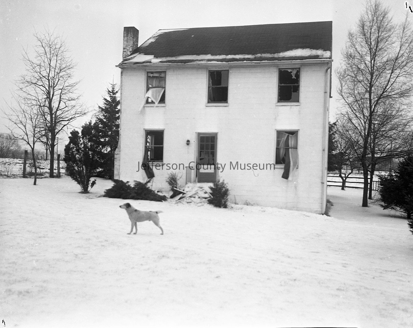 Dynamite truck explosion near Halltown on February 1, 1951. Photograph of the exterior of H. S. Koonce's house "3/4 of a mile" from the explosion.