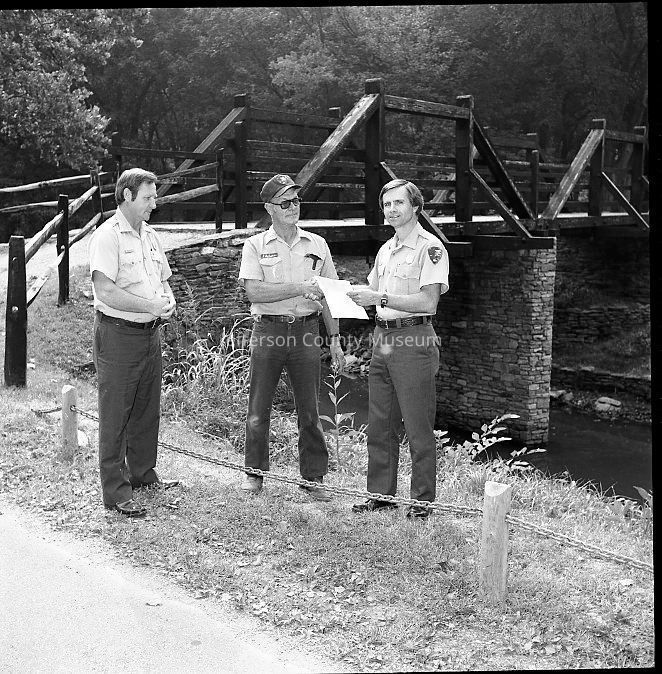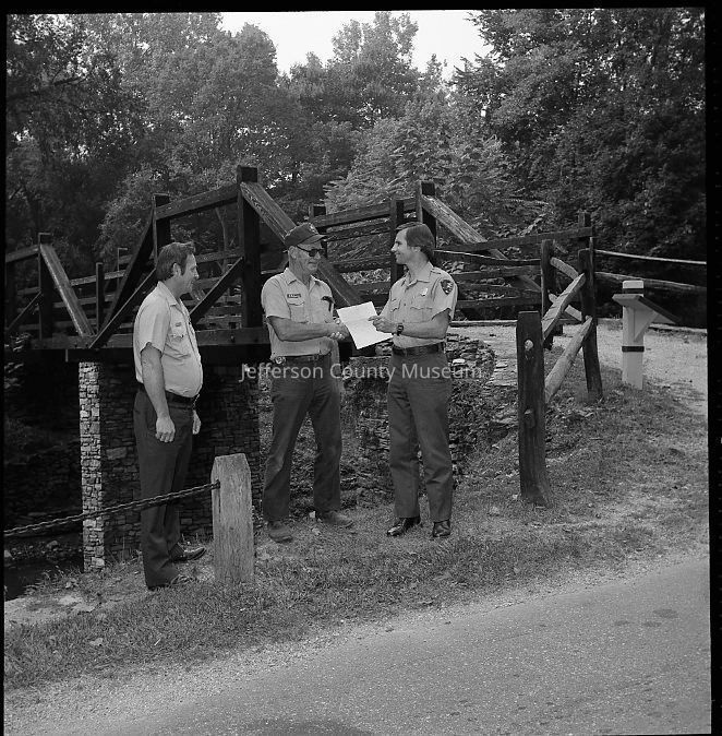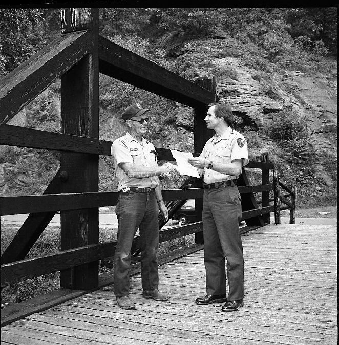 Superintendent Donald W. Campbell presenting an award to an unnamed National Park Service maintenance employee. The presentation is taking place either near or on the Randolph Bridge which connects Shenandoah Street to Virginius Island.