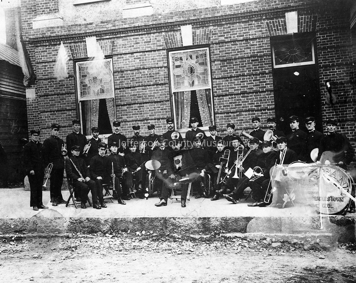 Henson's Band in front of the Jefferson Hotel on October 30, 1908. Photograph copied June 1975. Big meeting of the Shriners. P. W. Barr is third from left with clarinet.