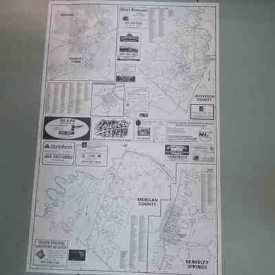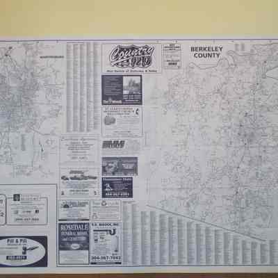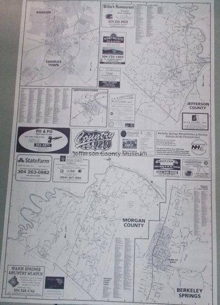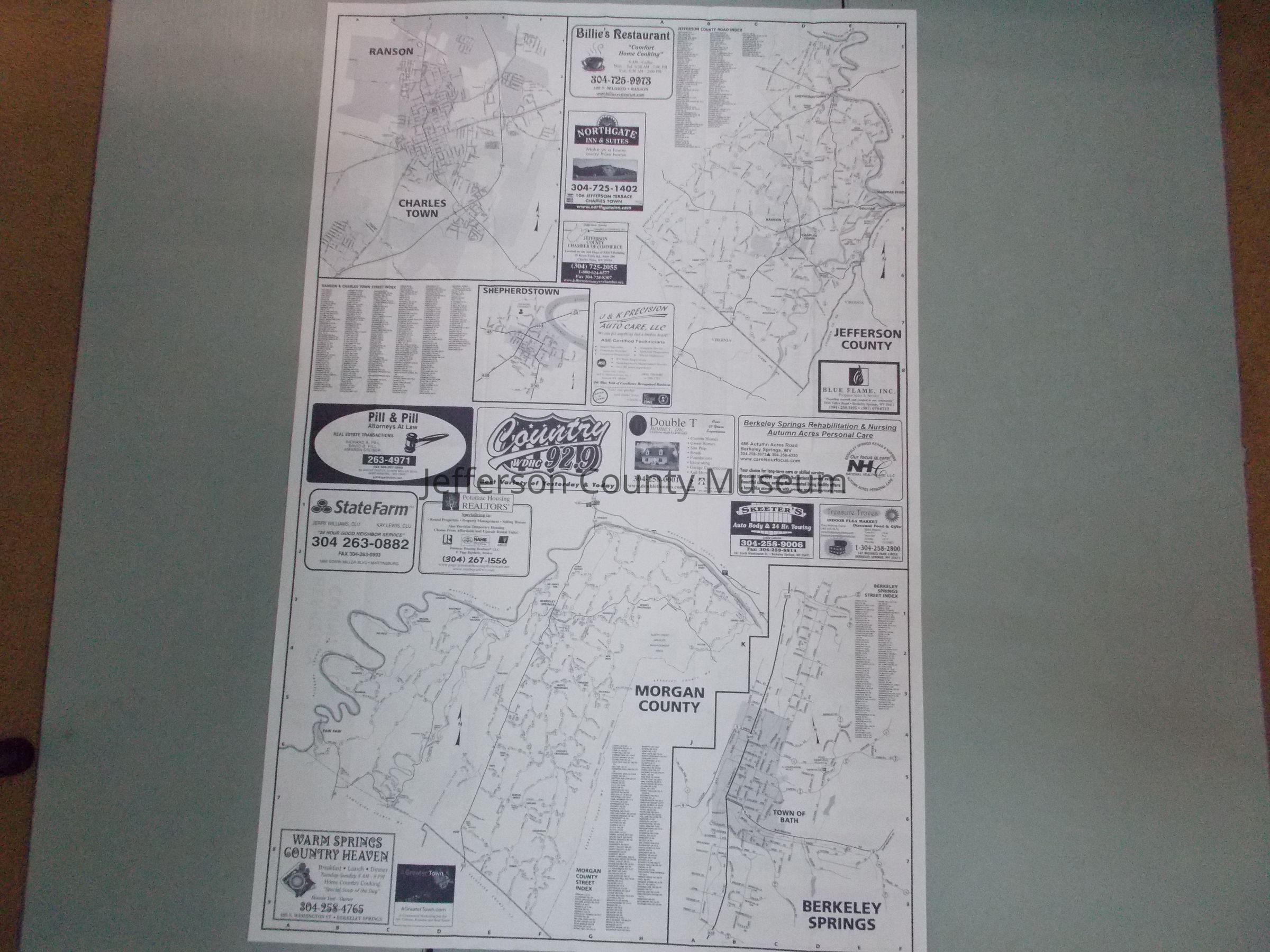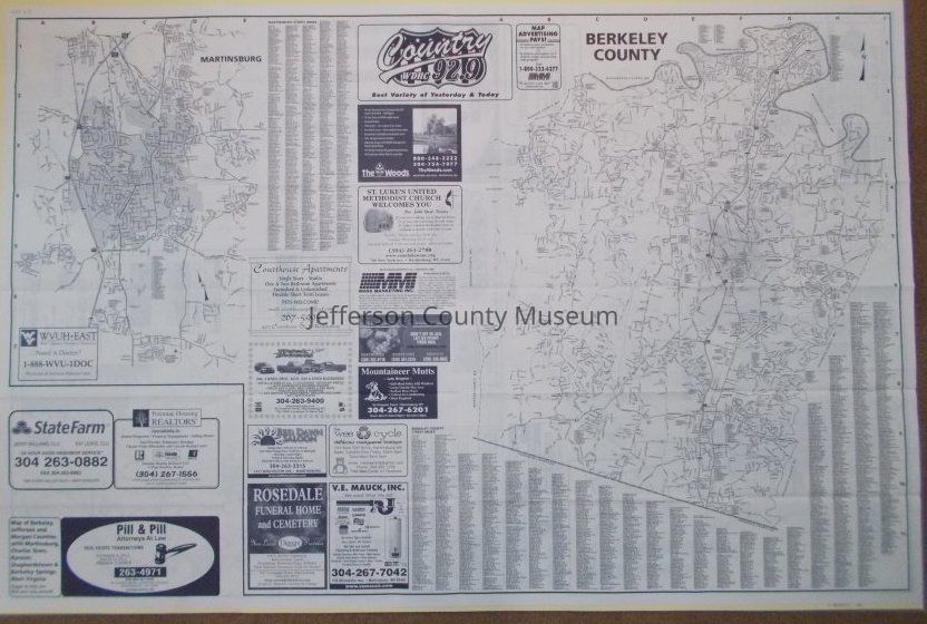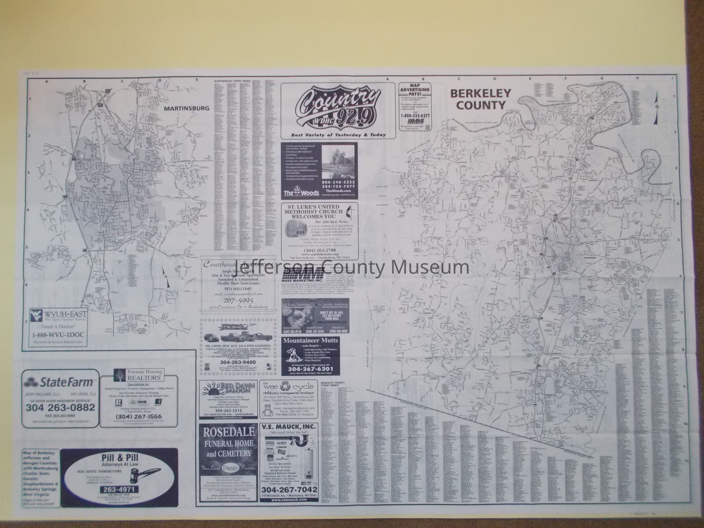 One side contains maps of Berkeley County and Martinsburg, along with associated street index for each; other side contains maps of Jefferson County, Charles Town/Ranson, Shepherdstown, Morgan County, and Berkeley Springs/Bath, along with associated street/road index for Jefferson County, Charles Town/Ranson, Morgan County, and Berkeley Springs. Each side also contains numerous advertisements of local businesses.