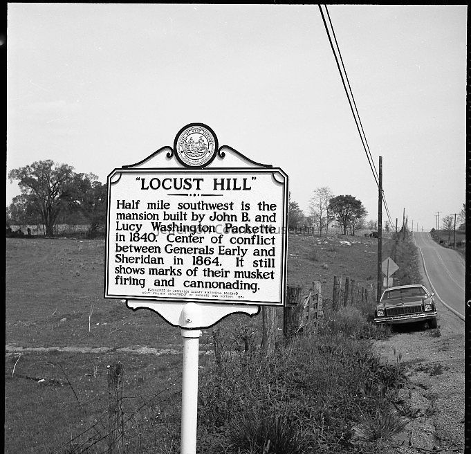 Locust Hill. West Virginia Highway Historical marker. Placed by the Jefferson County Historical Society in 1974. Text: Half mile southwest is the mansion built by John B. and Lucy Washington Packette in 1840. Center of conflict between Generals Early and Sheridan in 1864. It still shows marks of their musket firing and cannonading.
