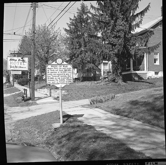 Text: Harpers Ferry was much sought by North and South, 1861-1865. Its garrison of 12,000 Union troops was captured by army of Gen. (Thomas) Stonewall Jackson, Sept. 15, 1862, on way to join Lee at Antietam. The Catholic Church was used as Federal hospital.