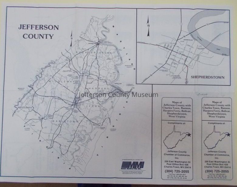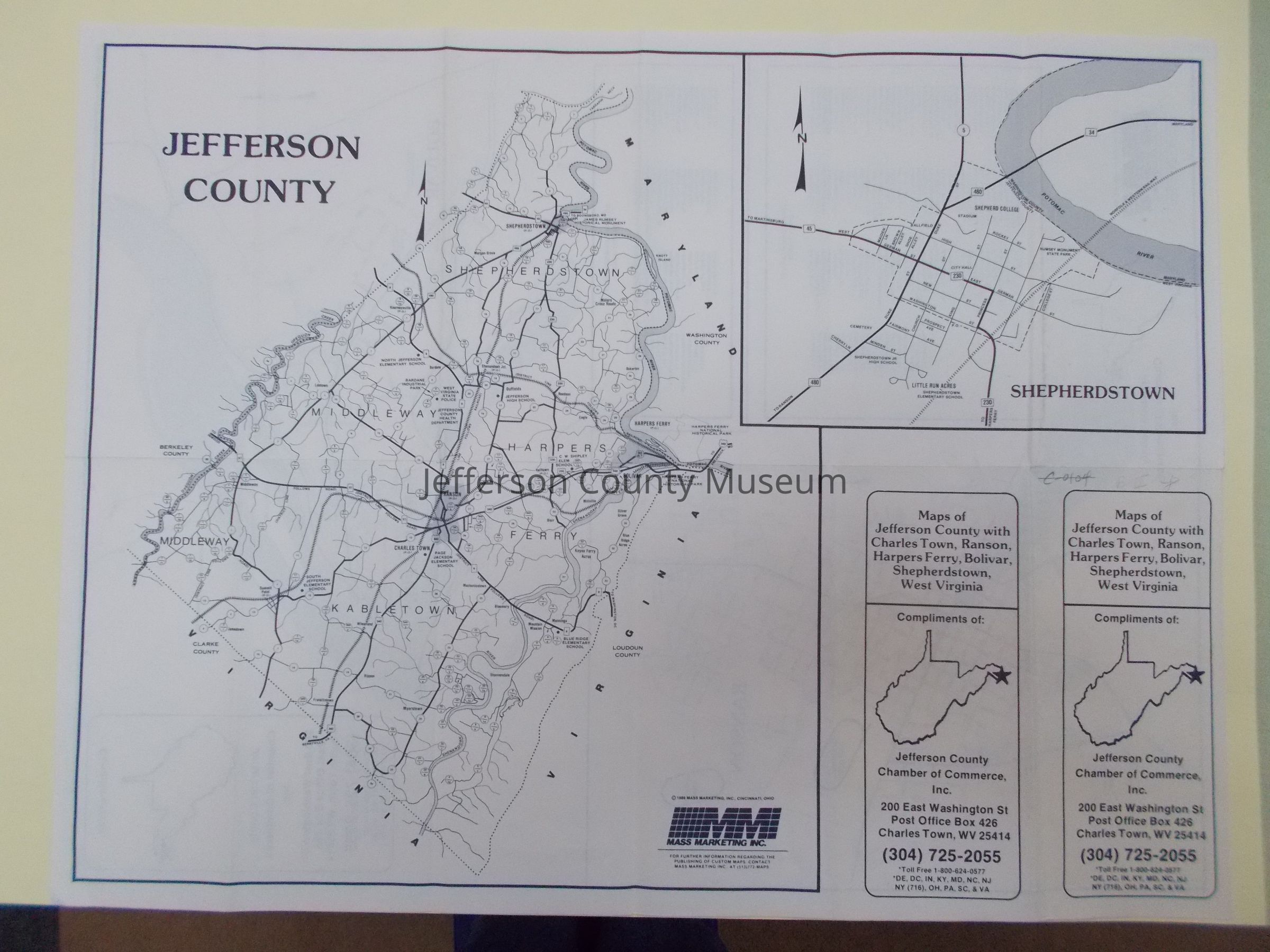 One side shows maps of Jefferson County and Shepherdstown; other side shows maps of Charles Town/Ranson and Bolivar/Harpers Ferry, along with an associated street index for Charles Town/Ranson and for Bolivar/Harpers Ferry. Distributed compliments of Jefferson County Chamber of Commerce.