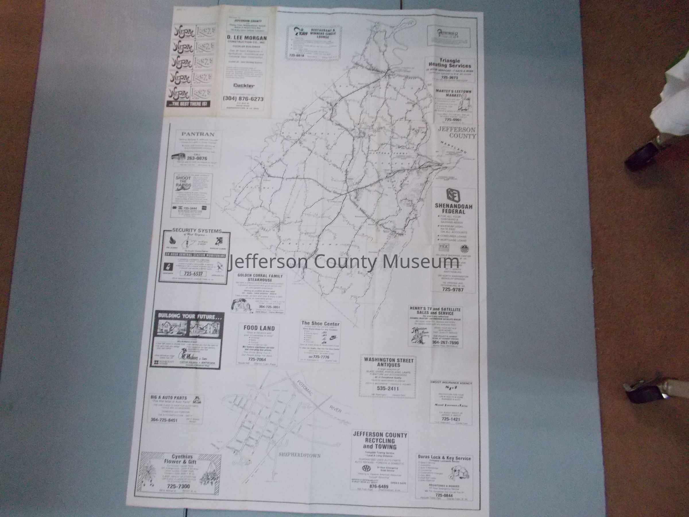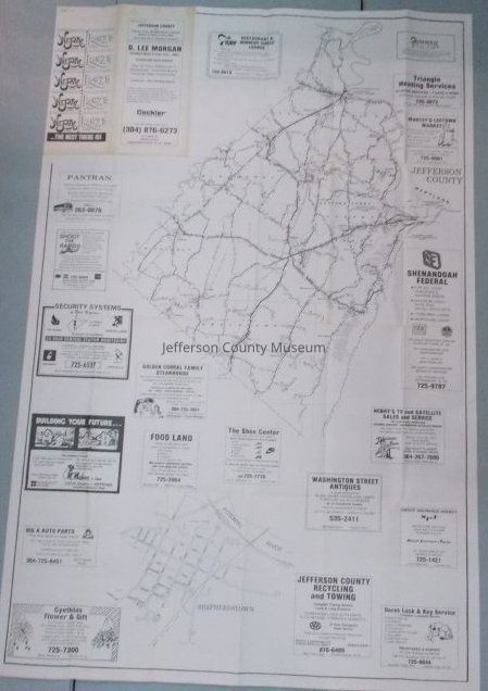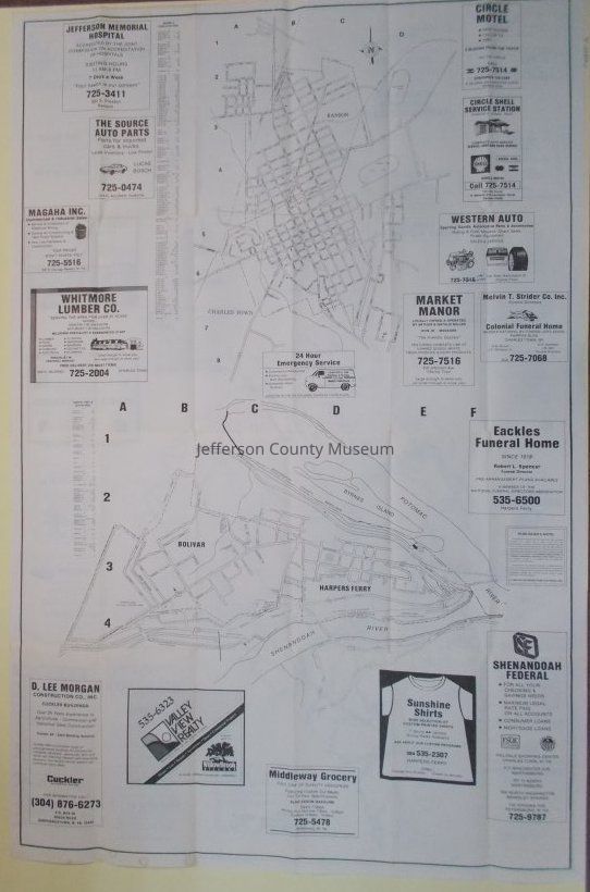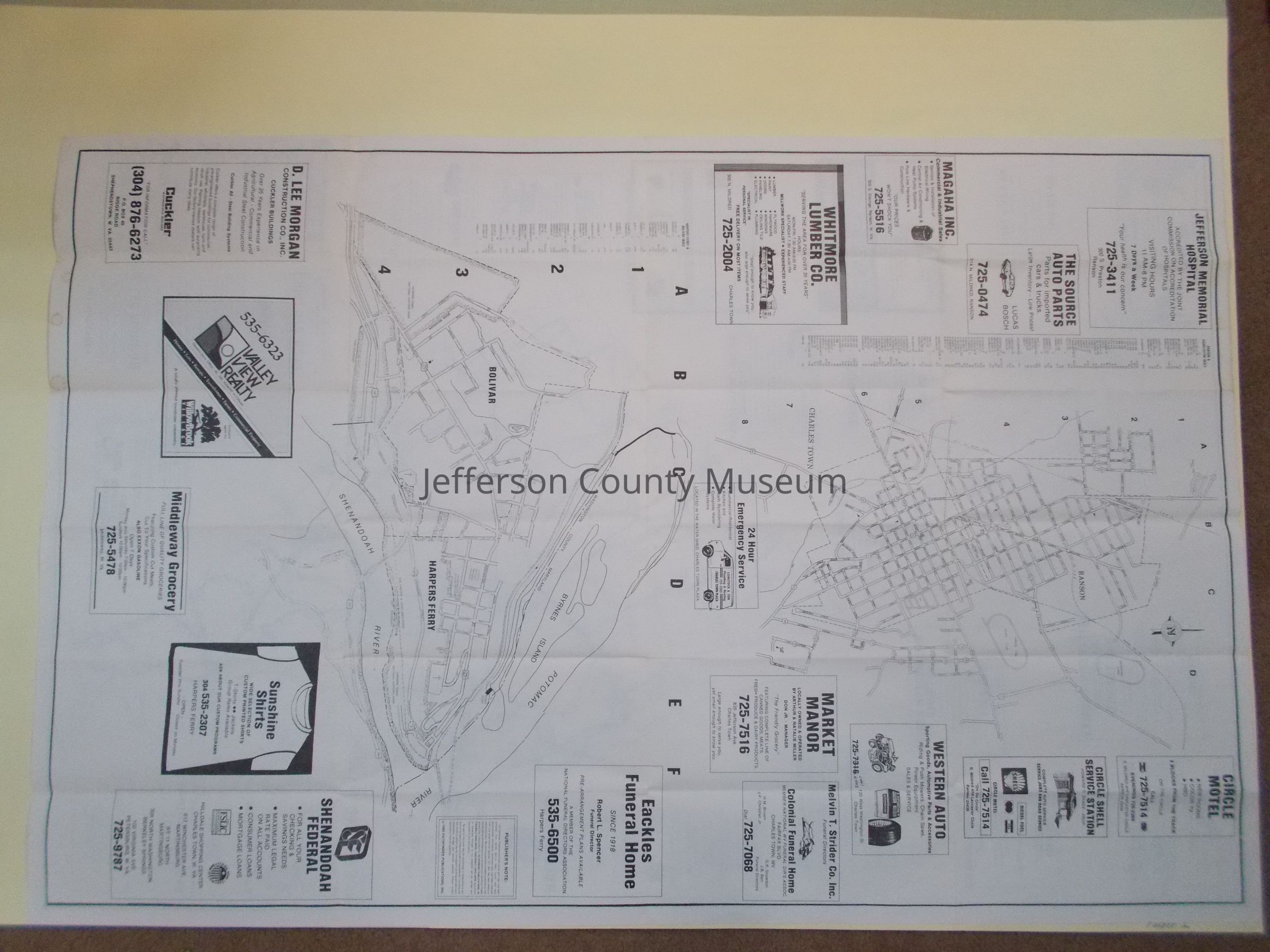Welcome To Jefferson County map. One side has maps of Jefferson County, West Virginia, and Shepherdstown; other side has maps of Charles Town/Ranson and Bolivar/Harpers Ferry, along with an associated street index for Charles Town/Ranson and for Bolivar/Harpers Ferry. Both sides have advertisements of local merchants.