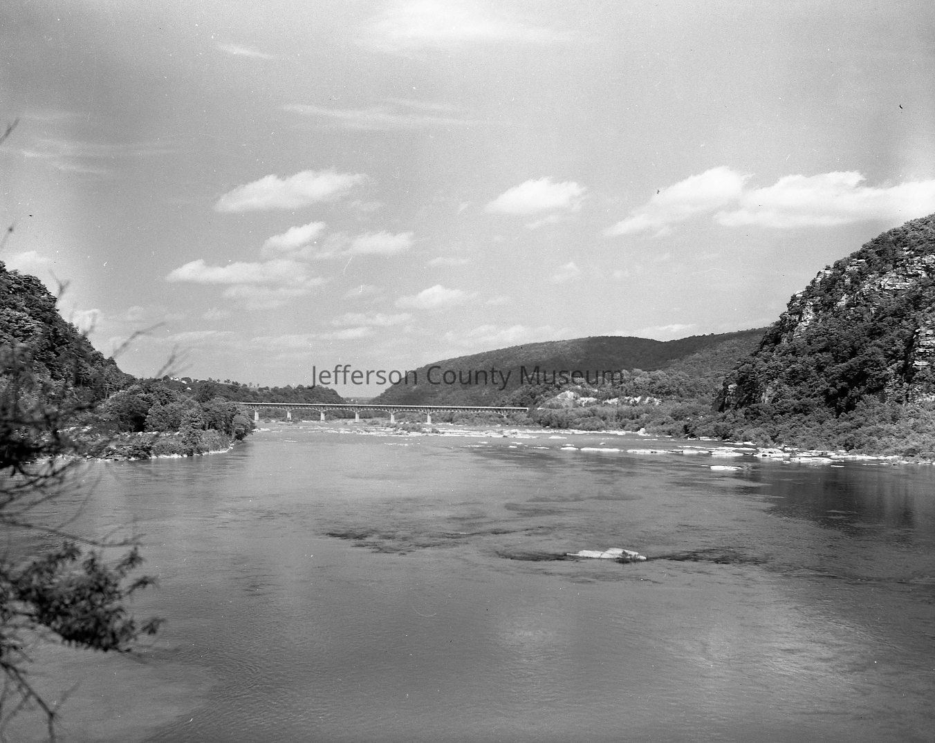 Harpers Ferry Gap. The Potomac River and Maryland Heights on the left, the Shenandoah River and Loudoun Heights on the right, The Gap and White Horse Rapids in the center of the photograph. In the distance are the Route 340 bridge over the Potomac River and Short Hill Mountain.