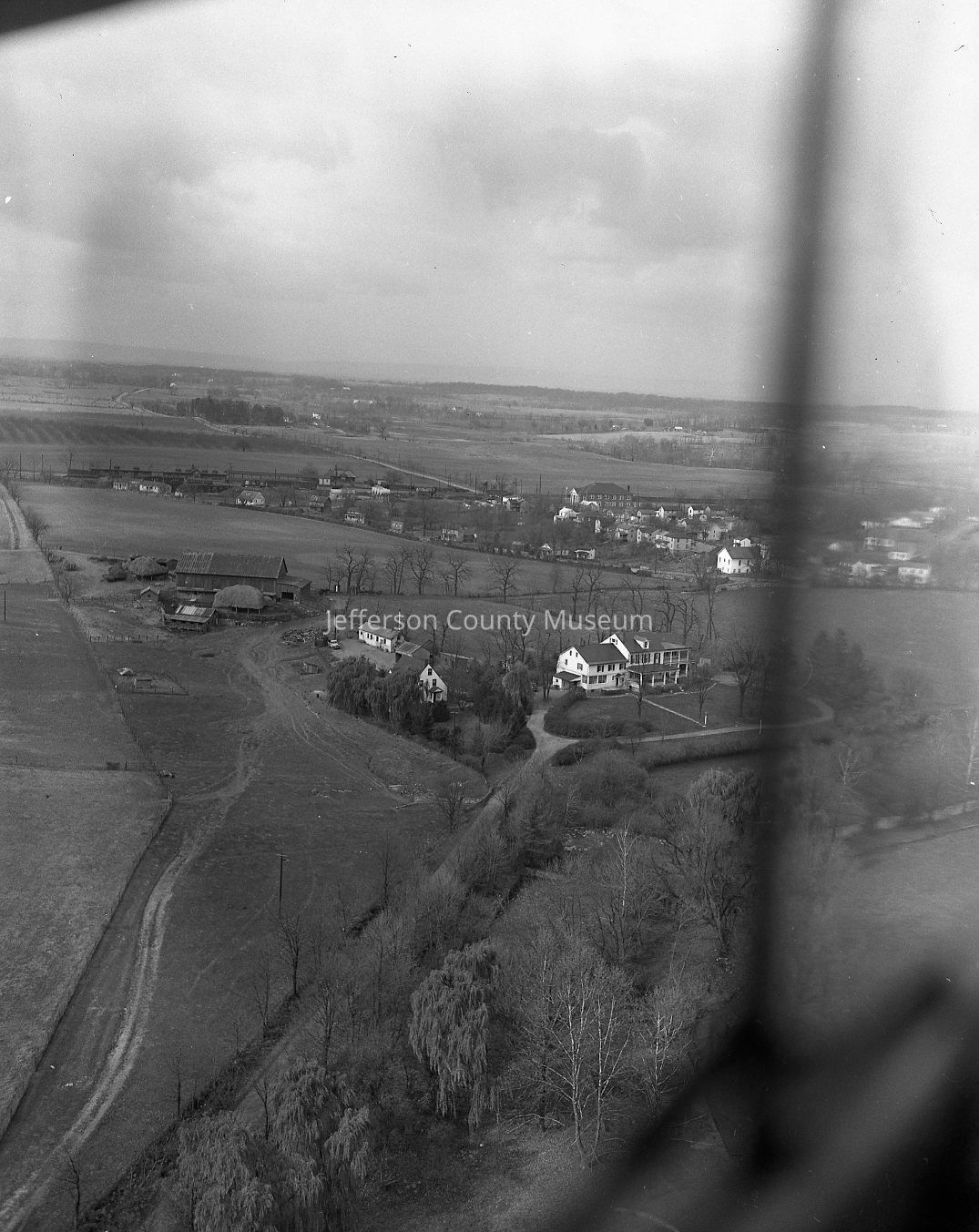 Aerial view of Charles Town. Central in the photograph is The Hill and a number of dependencies. The Hill was built by the Matthew Frame and currently owned by the Perry family. The Norfolk and Western Railroad runs left to right through the middle of the photograph. The N & W Station can be seen on the left and the original Shenandoah Valley Railroad station is just to the right. The road running diagonally into the countryside is present day Martin Luther King Boulevard/Route 51. Visible on Martin Luther King Boulevard is Zion Baptist Church and Eagle Avenue School. In the upper third of the photograph both Altona (Davenport) and Rosemont are visible.