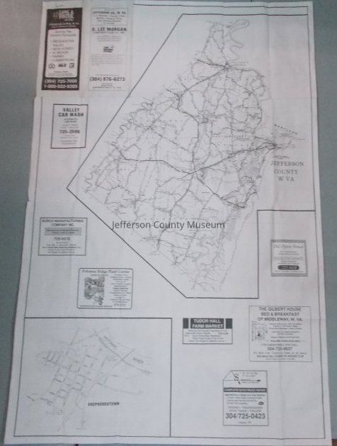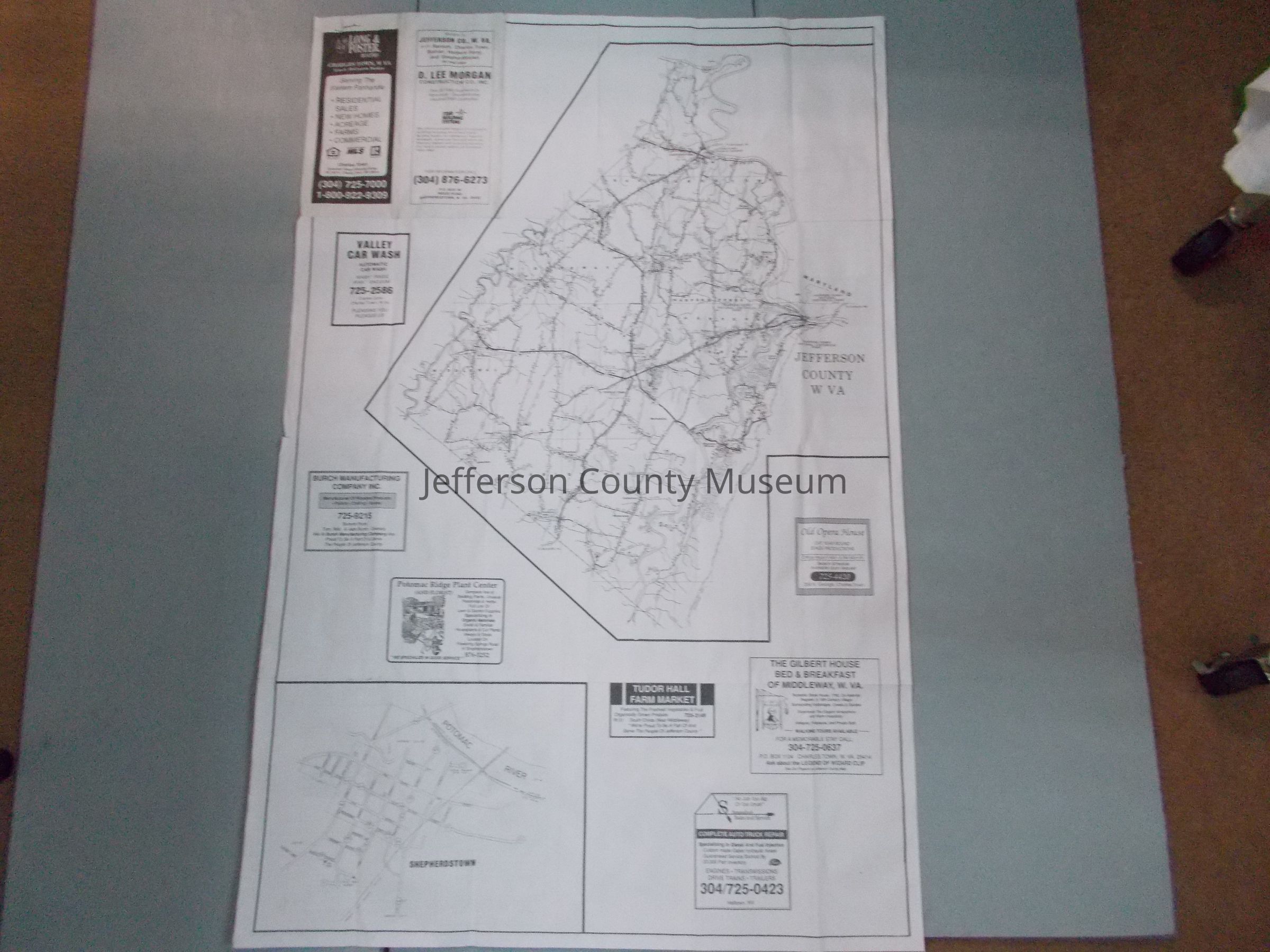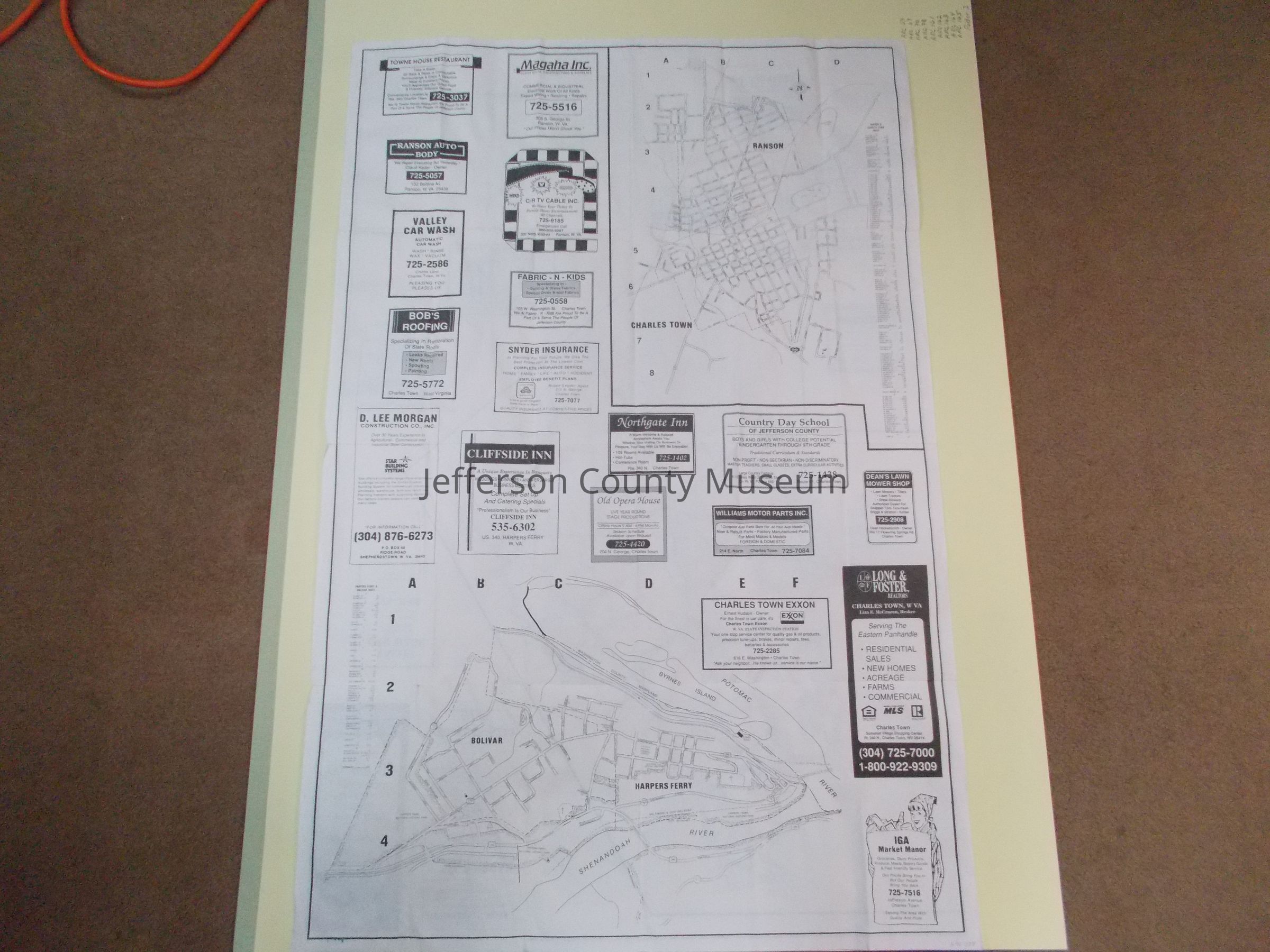 One side has maps of Jefferson County, West Virginia, and Shepherdstown; other side has maps of Charles Town/Ranson and Bolivar/Harpers Ferry, along with an associated street index for Charles Town/Ranson and for Bolivar/Harpers Ferry. Both sides have advertisements of local merchants.