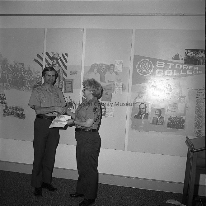 Awards presentations Harpers Ferry National Historical Park. Unknown awards presented to two (2) unidentified female by park superintendent Donald Campbell. Presentations made in the Storer College room in Wirth Hall at Mather Training Center.