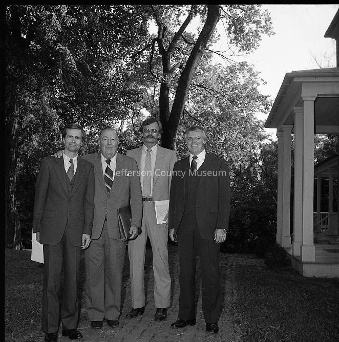 Presentation to U. S. Senator Jennings Randolph. Park superintendent is shown presenting a painting of Shenandoah Street in Harpers Ferry to United States Senator Jennings Randolph. Randolph was principally responsible for the establishment of Harpers Ferry as a National Monument in 1944 and succeeded in upgrading Harpers Ferry to a national historical park in 1968. Superintendent Donald Campbell, U. S. Senator Jennings Randolph, Unknown, and National Capitol Region Director Manus J. "Jack" Fish standing outside the Morrell House, park headquarters.Acquisition