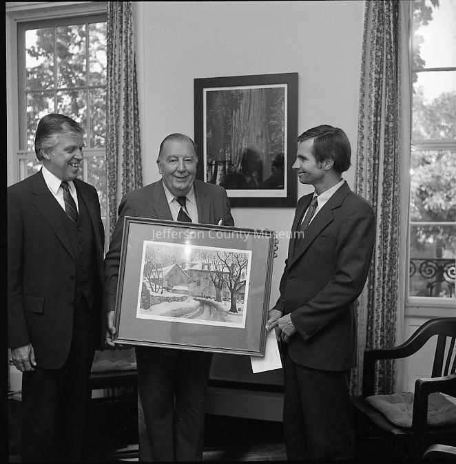 Presentation to U. S. Senator Jennings Randolph. Park superintendent is shown presenting a painting of Shenandoah Street in Harpers Ferry to United States Senator Jennings Randolph. Randolph was principally responsible for the establishment of Harpers Ferry as a National Monument in 1944 and succeeded in upgrading to a national historical park in 1968. Director Fish, Senator Randolph, and Superintendent Campbell standing in Campbell's office at the Morrell House.