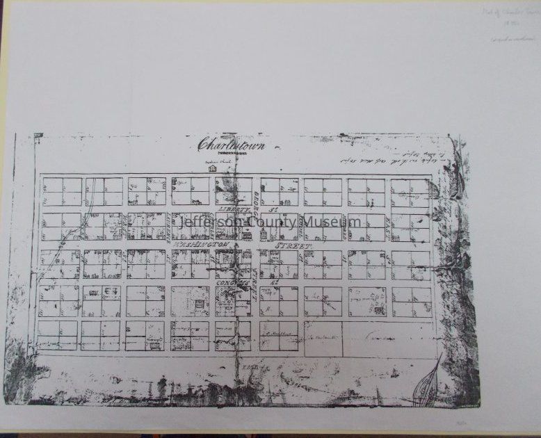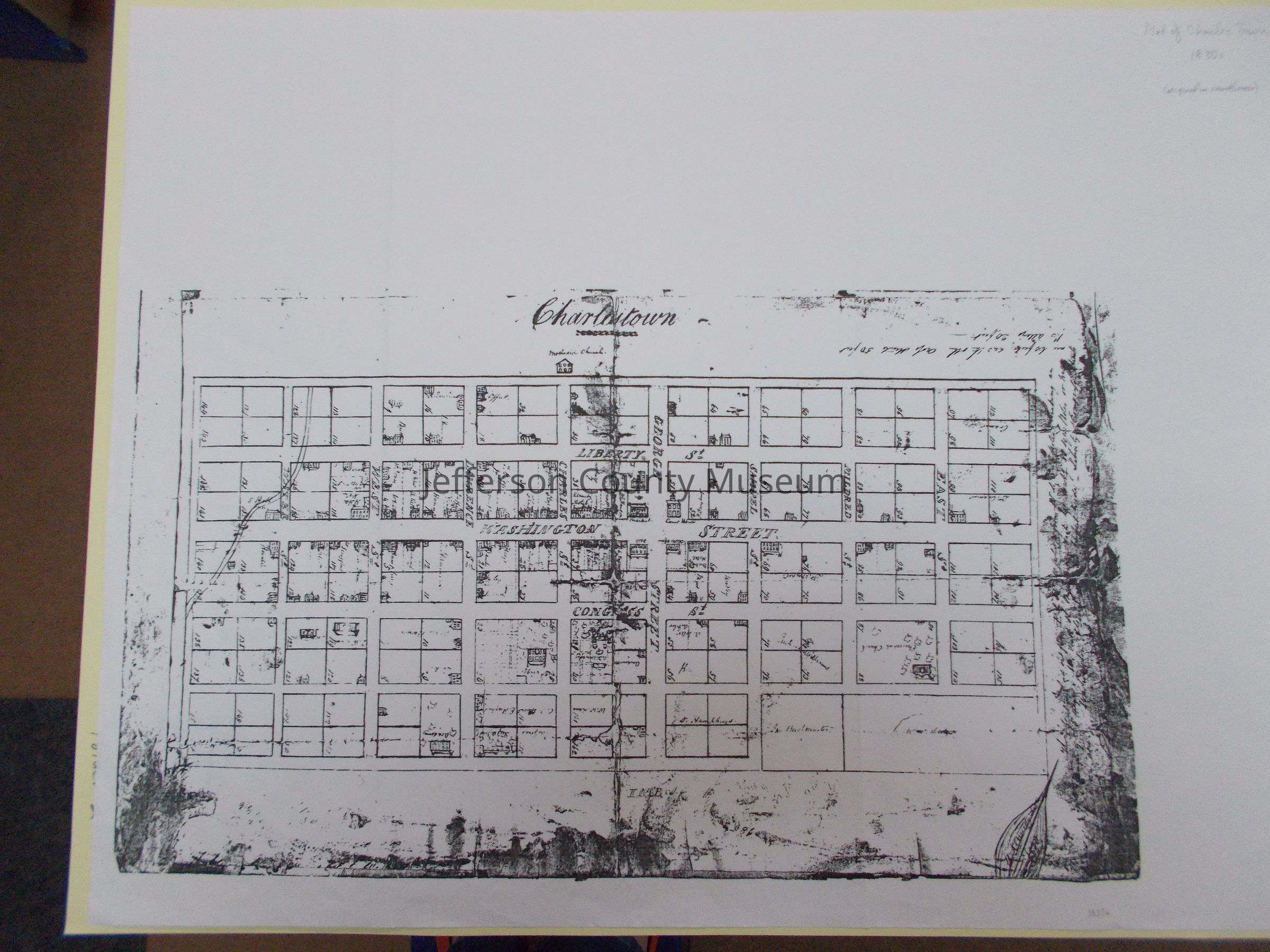 1830s plat of Charles Town showing Liberty Street, Washington Street, and Congress Street; showing cross streets of Water Street through East Street. Photocopied reference copy in drawer with this map. Original map at Court House.