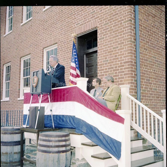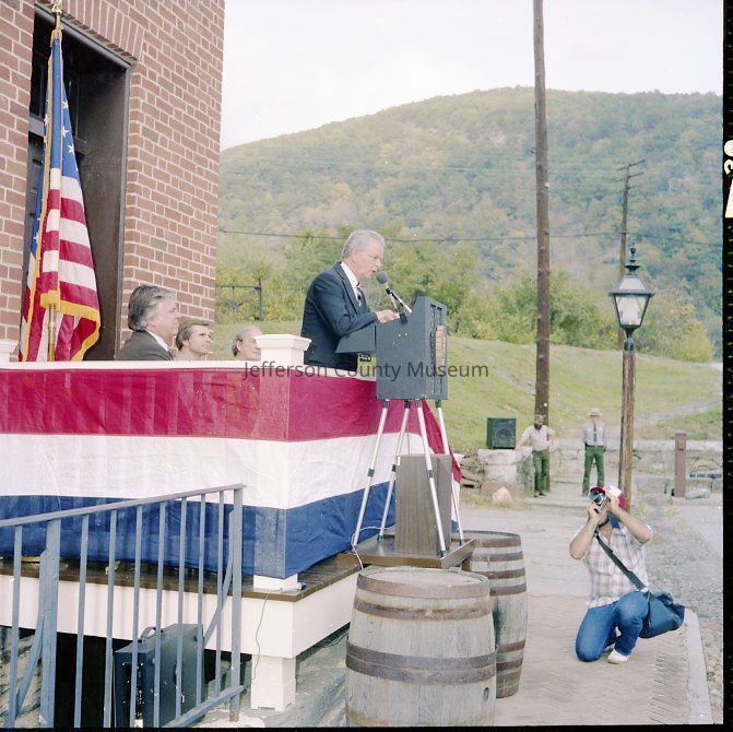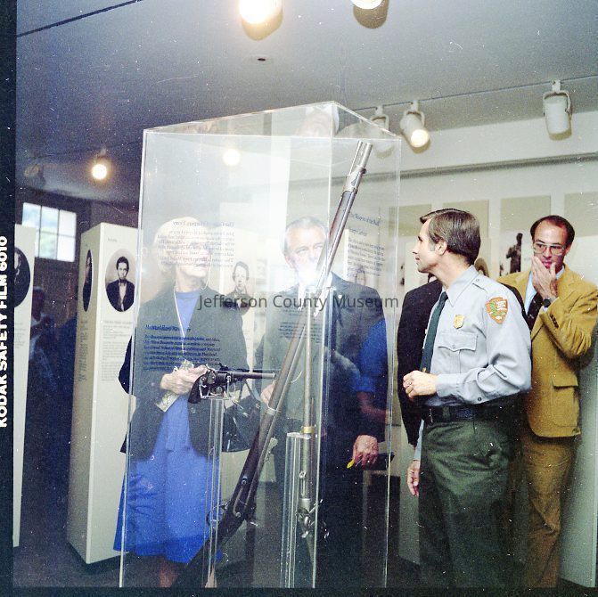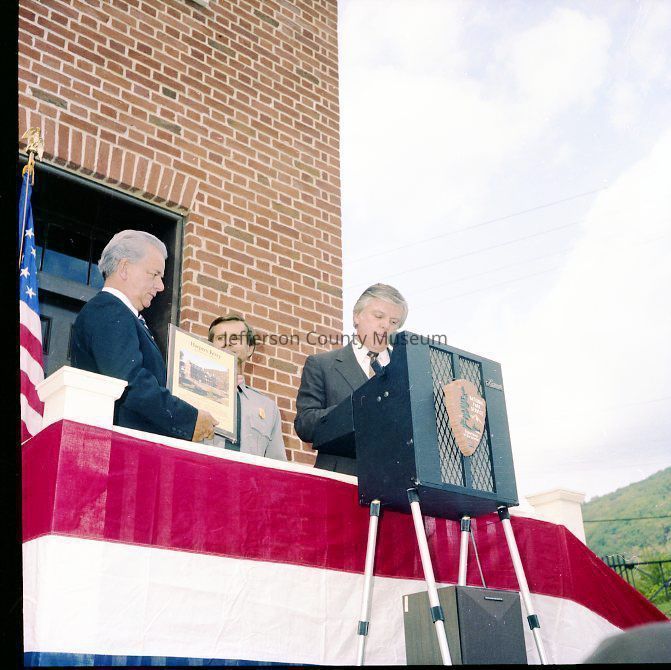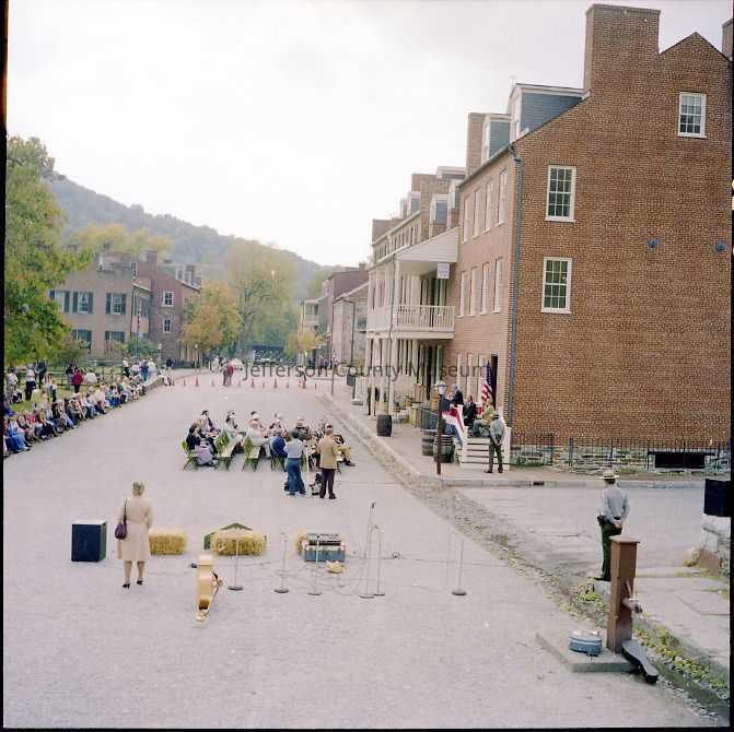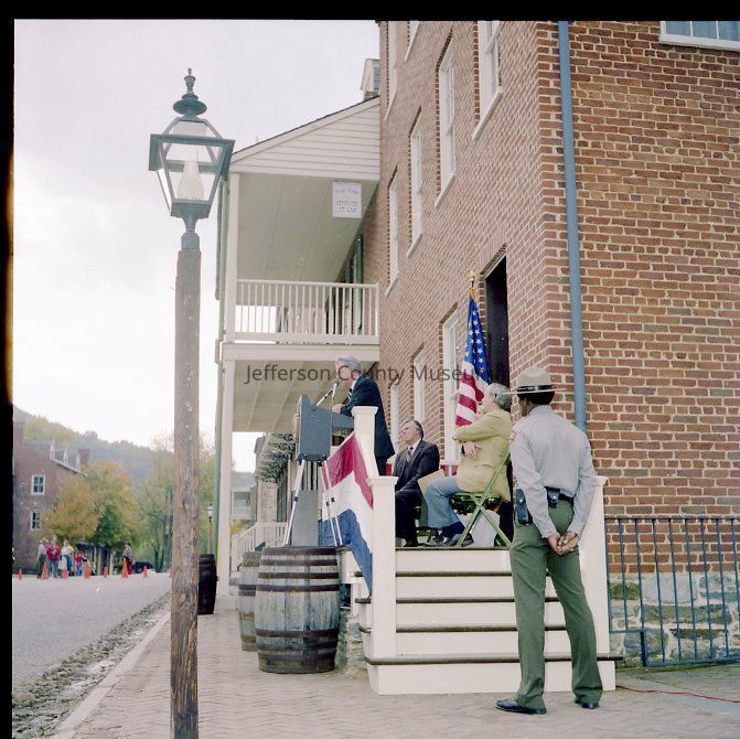 Dedication and grand opening of Package 110 in Harpers Ferry National Historical Park. Package 110 was one part of the NPS plan to restore the streetscape along Shenandoah Street to the time of the John Brown Raid (1859). Included in Package 110 were the Ann C. Stephenson building (Wetlands Exhibit), the William Anderson building, John C. Unseld building (John Brown Exhibit), and the Gerard Bond Wager building. Each building had park offices on the upper floors. All of the interior photographs are taken in the John C. Unseld building (John Brown Exhibit).