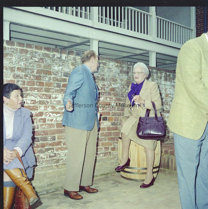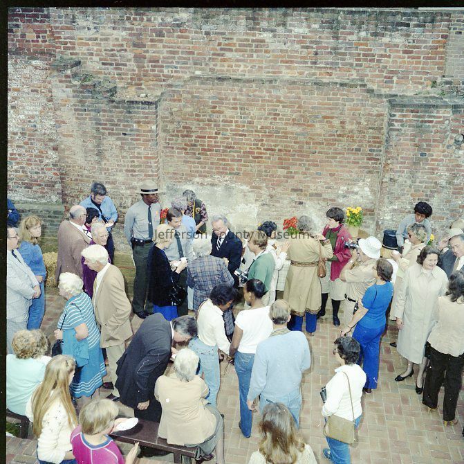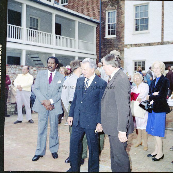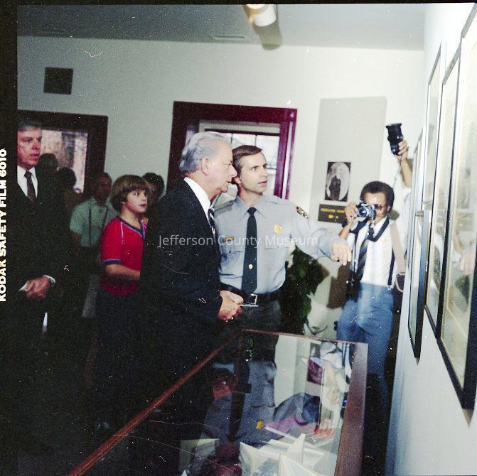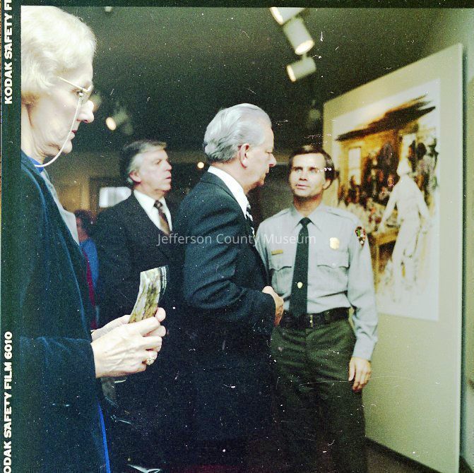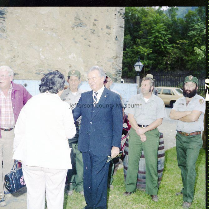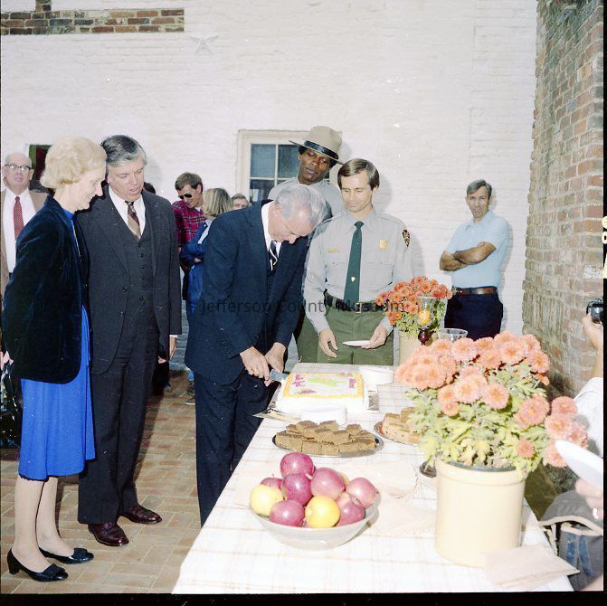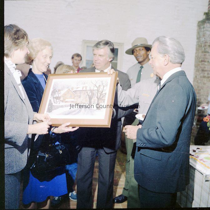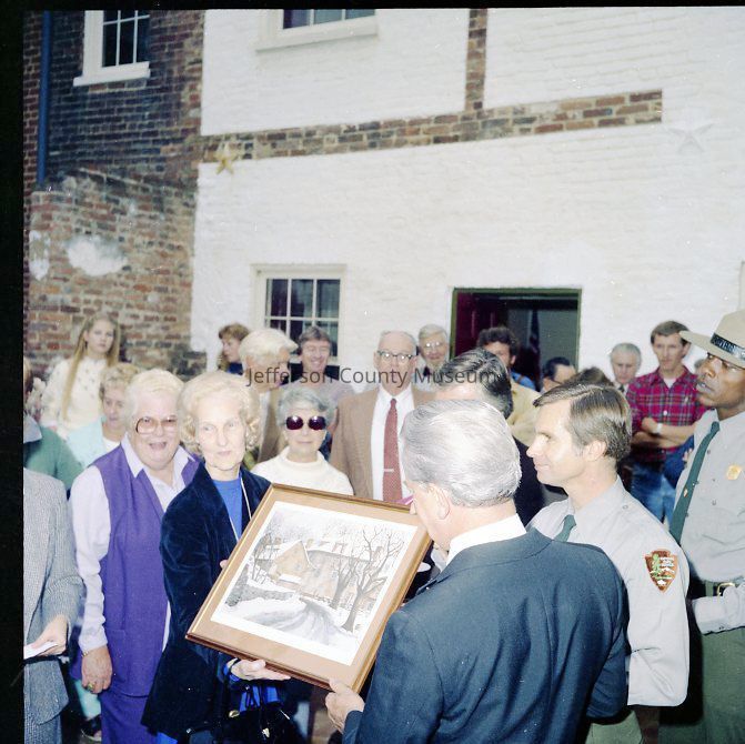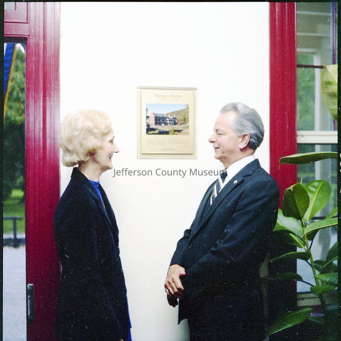 IMG1760: Left to right (ltor) Senator Byrd, Superintendent Campbell, and Manus J. "Jack" Fish (Regional Director, National Capitol Region, NPS); IMG1760-2: ltor - Mr. John Nathan Newcomer, Mrs. June H. Newcomer, Mrs. Jeanne Kellam Franzen, Mr. Archie W. Franzen (Architect, Harpers Ferry National Historical Park), and UNK; IMG1760-4: ltor Superintendent Campbell, Mrs. Byrd, Senator Byrd (cutting ribbon); Director Fish, and Reverend Henshaw at grand opening of the John Brown exhibit; IMG1760-5: ltor Senator Byrd, Superintendent Campbell, and Reverend Henshaw on porch outside John C. Unseld building; IMG1760-6: guests at public reception - Preston S. Smith (blue jacket - Public Information Officer); IMG1760-7: ltor Philip Henry Perks (yellow jacket), Robert G. Stanton (Deputy Director, National Capitol Region, NPS), Superintendent Campbell, Senator Byrd, Director Fish, UNK, and Mrs. Byrd; IMG1760-8: view of dedication of Package 110 looking east up Shenandoah Street shows Senator Byrd speaking from porch in front of the Unseld building and guests seated in Shenandoah Street and on wall along arsenal square; IMG1760-9: ltor presentation to Senator Byrd, Superintendent Campbell, and Director Fish (speaking); IMG1760-10: presentation of picture Harpers Ferry in Winter (artist Eric Mohn a quadriplegic who painted holding a brush in his mouth) to Mrs. Byrd - ltor Deborah K. Piscitelli (Director, Harpers Ferry Historical Association), Mrs. Byrd, Director Fish, and Senator Byrd; IMG1760-11: ltor - Mrs. Erma Ora Byrd (wife of U. S. Senator Robert Carlyle Byrd) and Senator Byrd; IMG1760-12: ltor - reception on patio behind John Brown exhibit - in the crowd - Mr. and Mrs. Newcomer (left), Mrs. Byrd, Superintendent Campbell, and Senator Byrd talking with guests (center), Ranger Gwenny Roper (top right), and Director Fish talking with woman seated on bench (lower center); IMG1760-13, IMG1760-14, IMG1760-3: Senator Byrd on porch outside John C. Unseld building addressing guests; IMG1760-15: ltor - Mrs. Byrd; Director Fish, Senator Byrd, and Superintendent Campbell; IMG1760-16: ltor - Mrs. Byrd, Senator Byrd, and Superintendent Campbell in the John Brown exhibit (John C. Unseld building); IMG1760-17: ltor - Superintendent Campbell, Senator Byrd (cutting cake), Director Fish, and Mrs. Byrd at reception behind John Brown exhibit; IMG1760-18: Senator Byrd with four unidentified NPS maintenance employees and unidentified guests; IMG1760-19: ltor - United States Senator Robert Carlyle Byrd and Donald W. Campbell (Superintendent, Harpers Ferry National Historical Park; IMG1760-20: ltor - Superintendent Campbell and Senator Byrd; IMG1760-21 - IMG1760-22: ltor - Senator Byrd (addressing crowd), Superintendent Campbell, Reverend Roger Henshaw (Rector, Zion Episcopal Church), and UNK on porch of the Gerard Bond Wager building.Acquisition