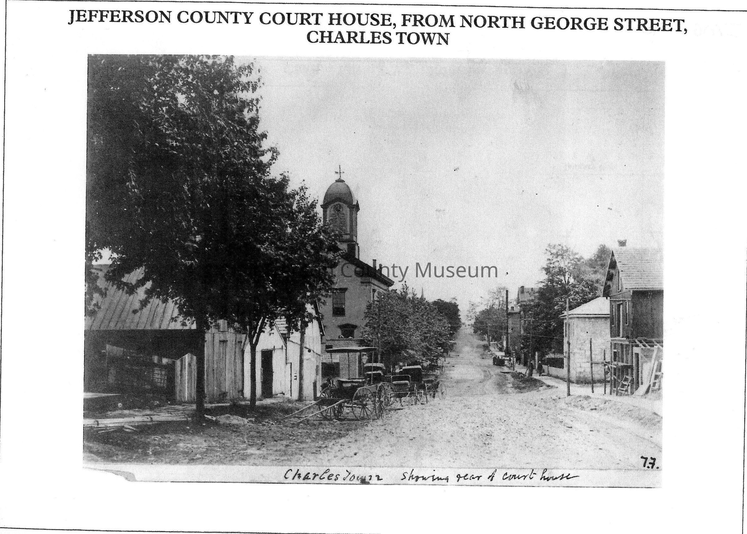 North George Street. View of George Street taken near the intersection with North Street looking south. Visible on the left is the back (north side) of the Jefferson County Court House and the livery stables located there. On the right looking south the office building on the southwest corner of George and Congress Streets, the fence around Paradise, Charles Washington Hall, and just visible is the southwest corner of the Jefferson County Jail.
