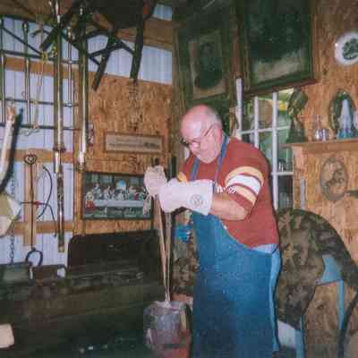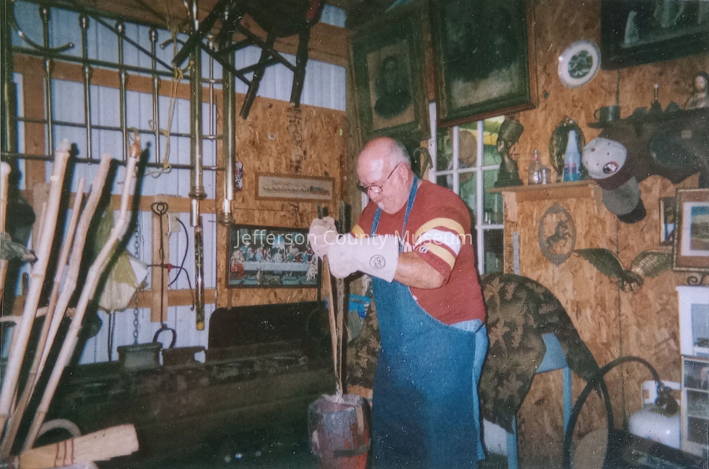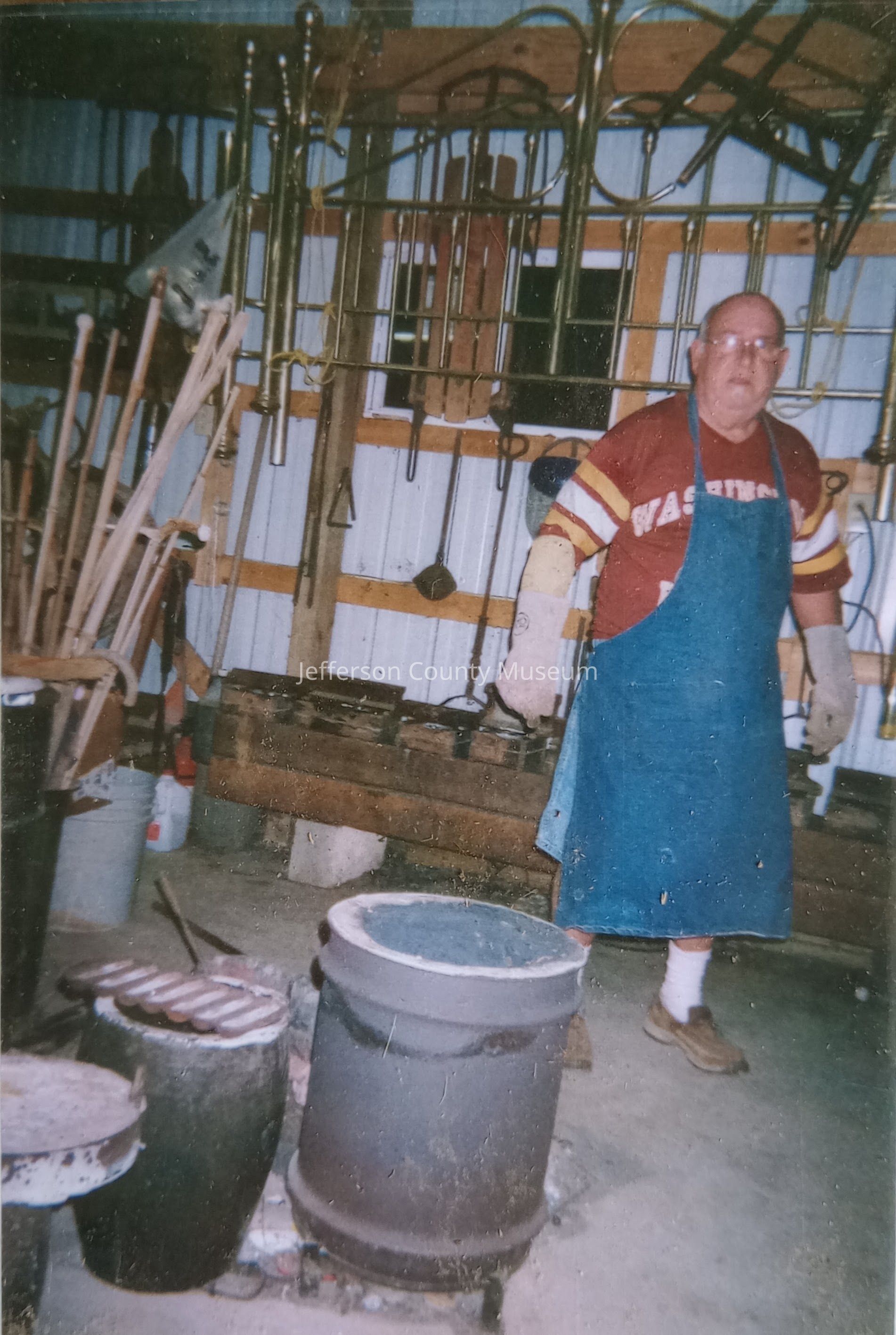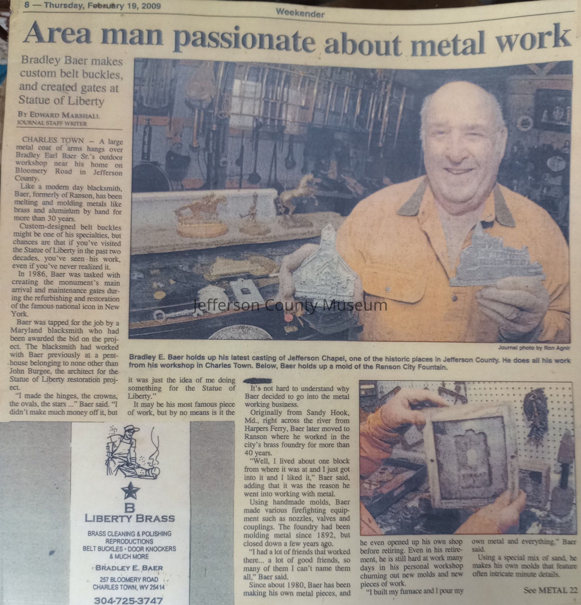 Seven (7) digital images of Bradley Baer working to create items out of brass in his home on Bloomery Road as well as other local images collected by Baer. Other photos include a 2009 Martinsburg Journal clipping about Baer's talent for metalworking, a photo of the original Dairy Queen in Ranson, and a picture of Patsy Cline, Bill Peer, Steve Lawrence, and Bobby Carter performing for WEPM radio, c. 1950s.Photograph Details
