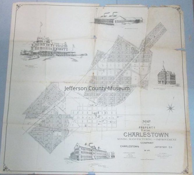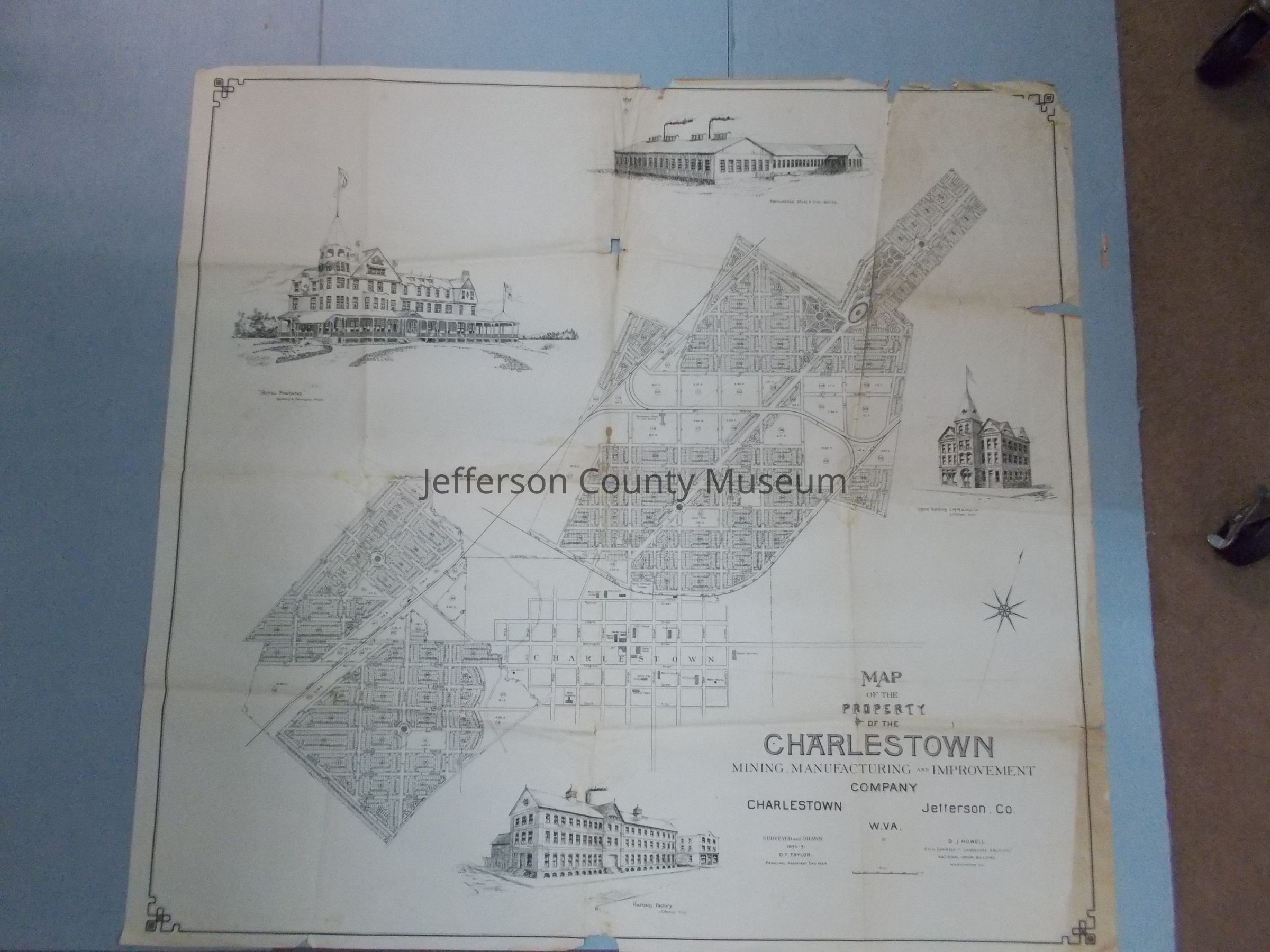 Map of Charles Town and Ranson, West Virginia, c1890s, with planned projections for the west side of Charles Town that were not developed. Includes artists' renderings of Hotel Powhatan, Harness Factory, Office Building C.M.M. & Imp. Co., and Shenandoah Brass & Iron Works. Surveyed and drawn by D.F. Taylor, Principal Assistant Engineer. D.J. Howell, Civil Engineer and Landscape Architect.