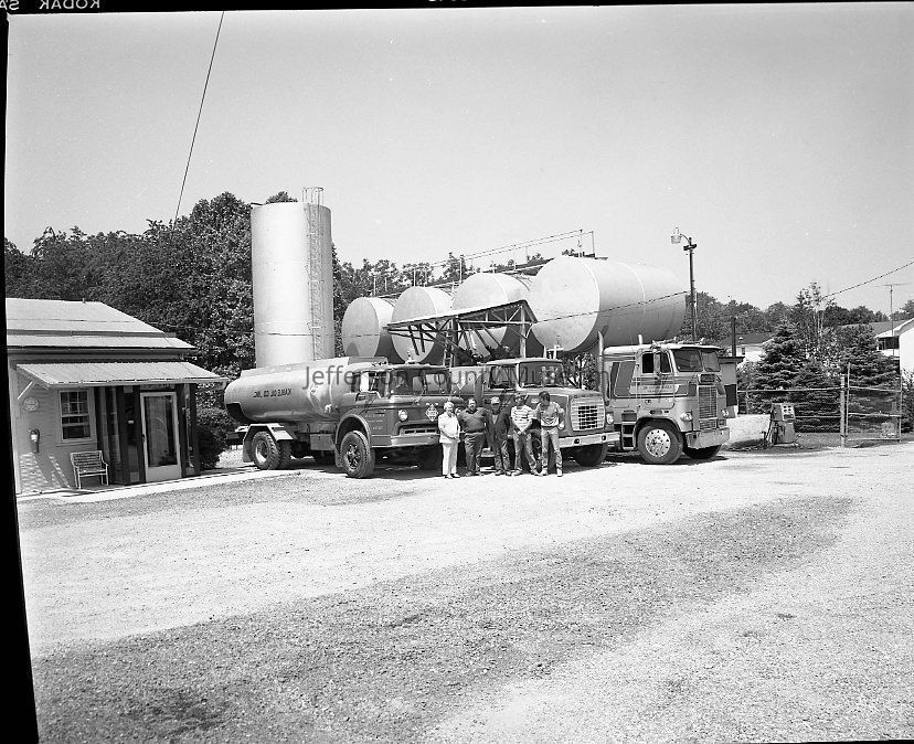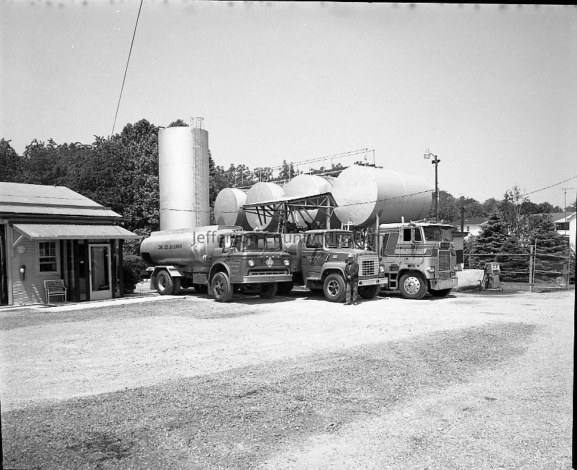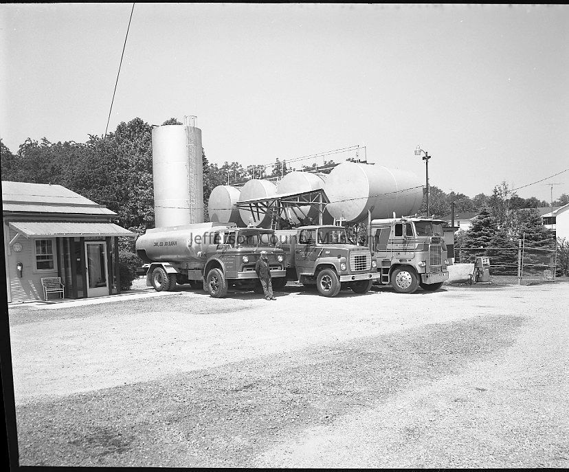 IMG1770-1 to IMG1770-3 and IMG1770-5: Office on left, three heating oil tank trucks, unidentified employee(s), and four bulk storage tanks.