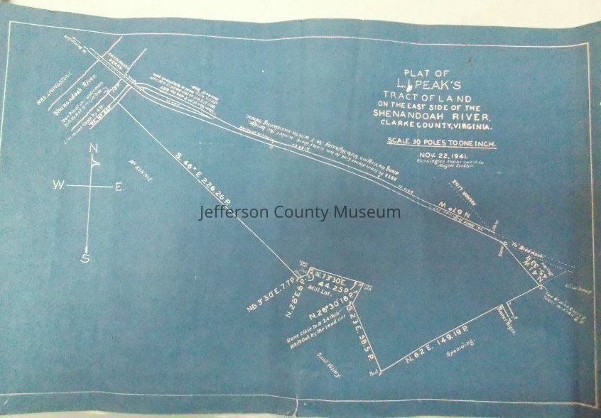 Blueprint survey of L. I. Peak's tract of land on the east side of the Shenandoah River, Clarke County, Virginia; from Castleman's Ferry to Winekoup property; bounded by Virginia route 7 on one side and other property owners on other side.Acquisition