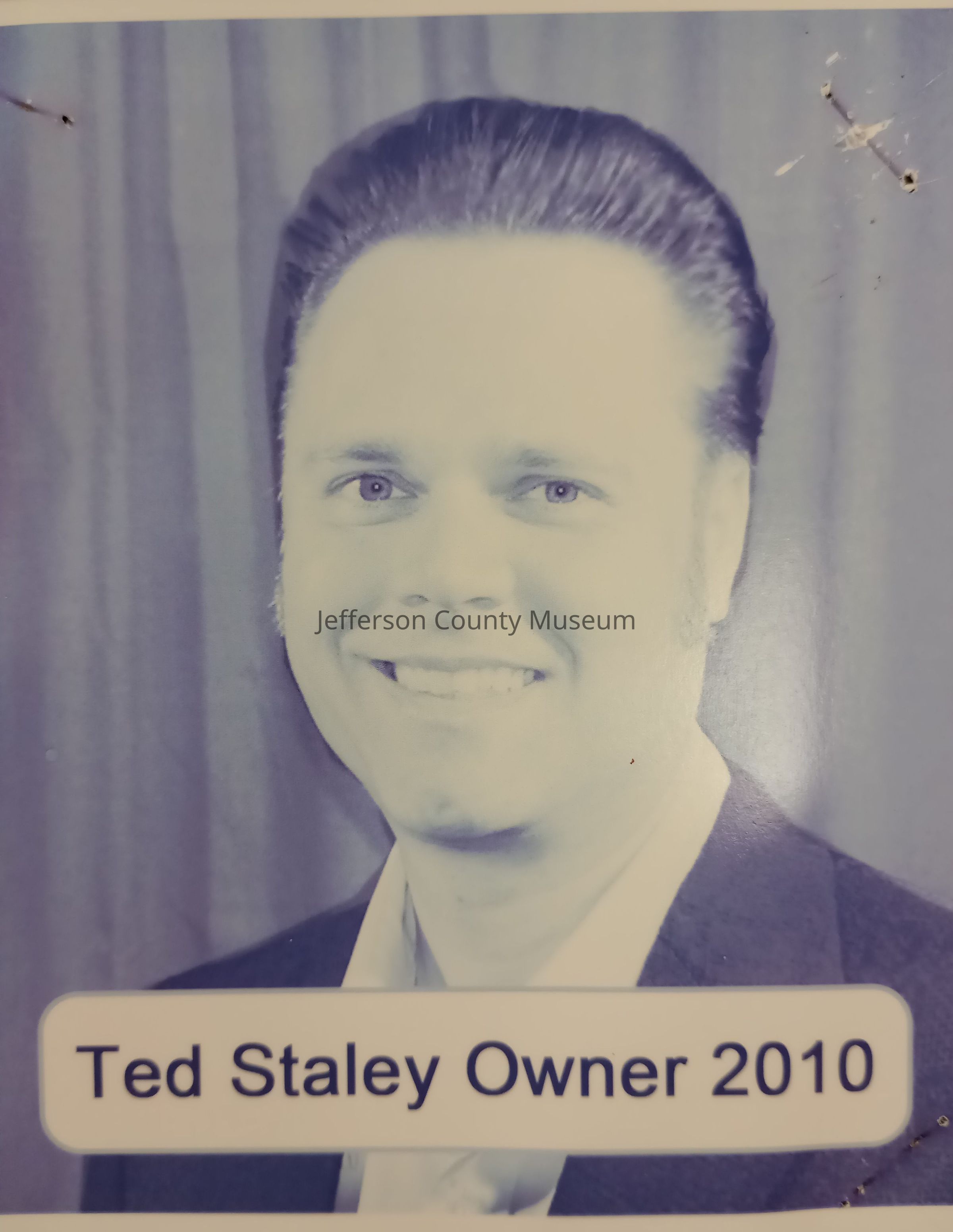 Black and white photograph of Ted Staley, the final owner of the John Brown Wax Museum in Harpers Ferry, with caption "Ted Staley Owner 2010".Photograph Details