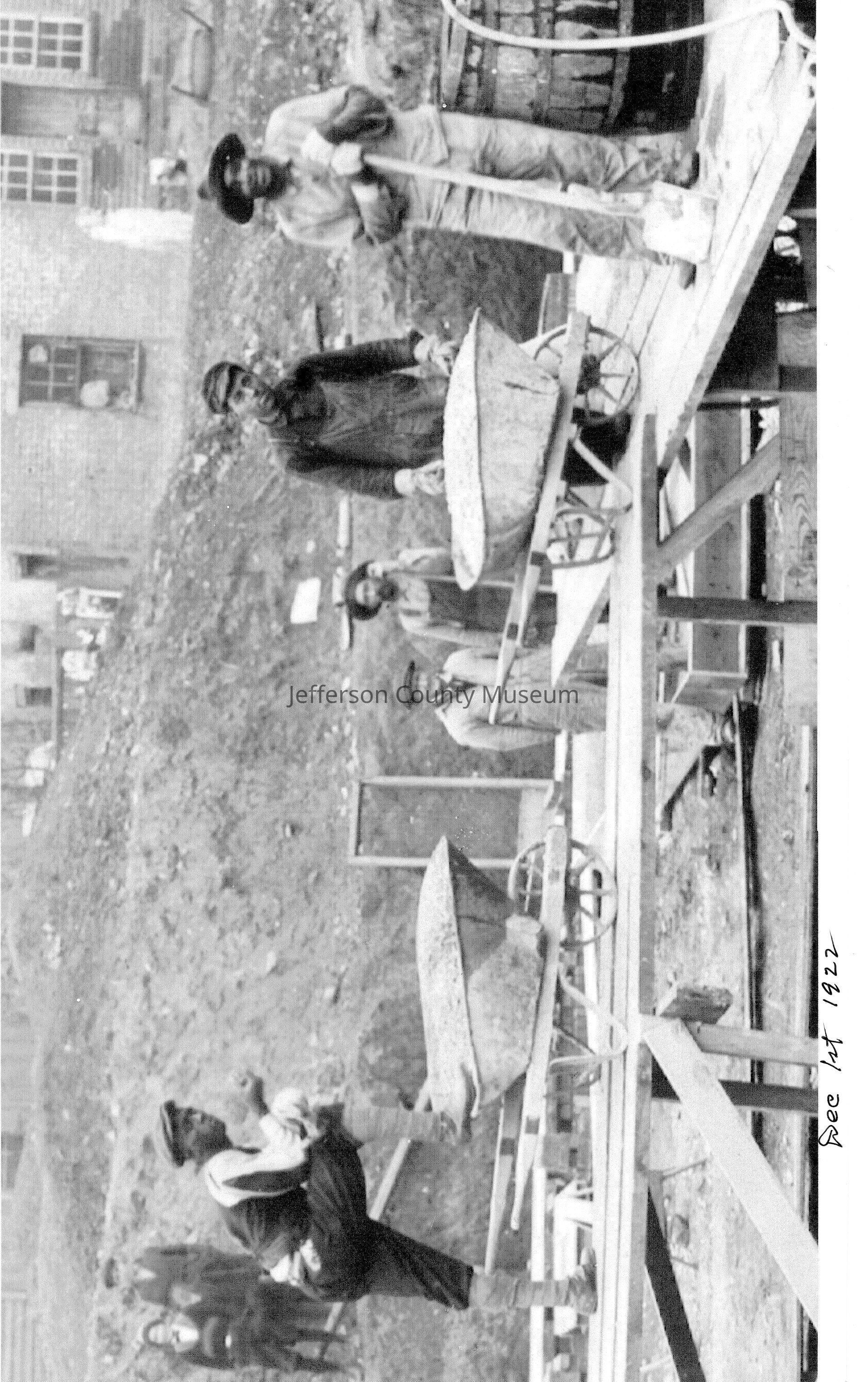 United States Post Office in Charles Town (northwest corner of George and Washington Streets) under construction. Five men (African American and White) are shown - none identified. Three unidentified children stand in the background on the left. The Virginia Products Co. Building can be seen in the upper right hand corner of the photograph. Hand written date on the photograph is Dec 1st 1922.