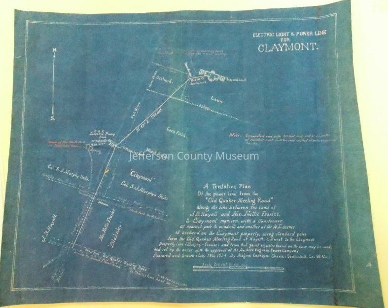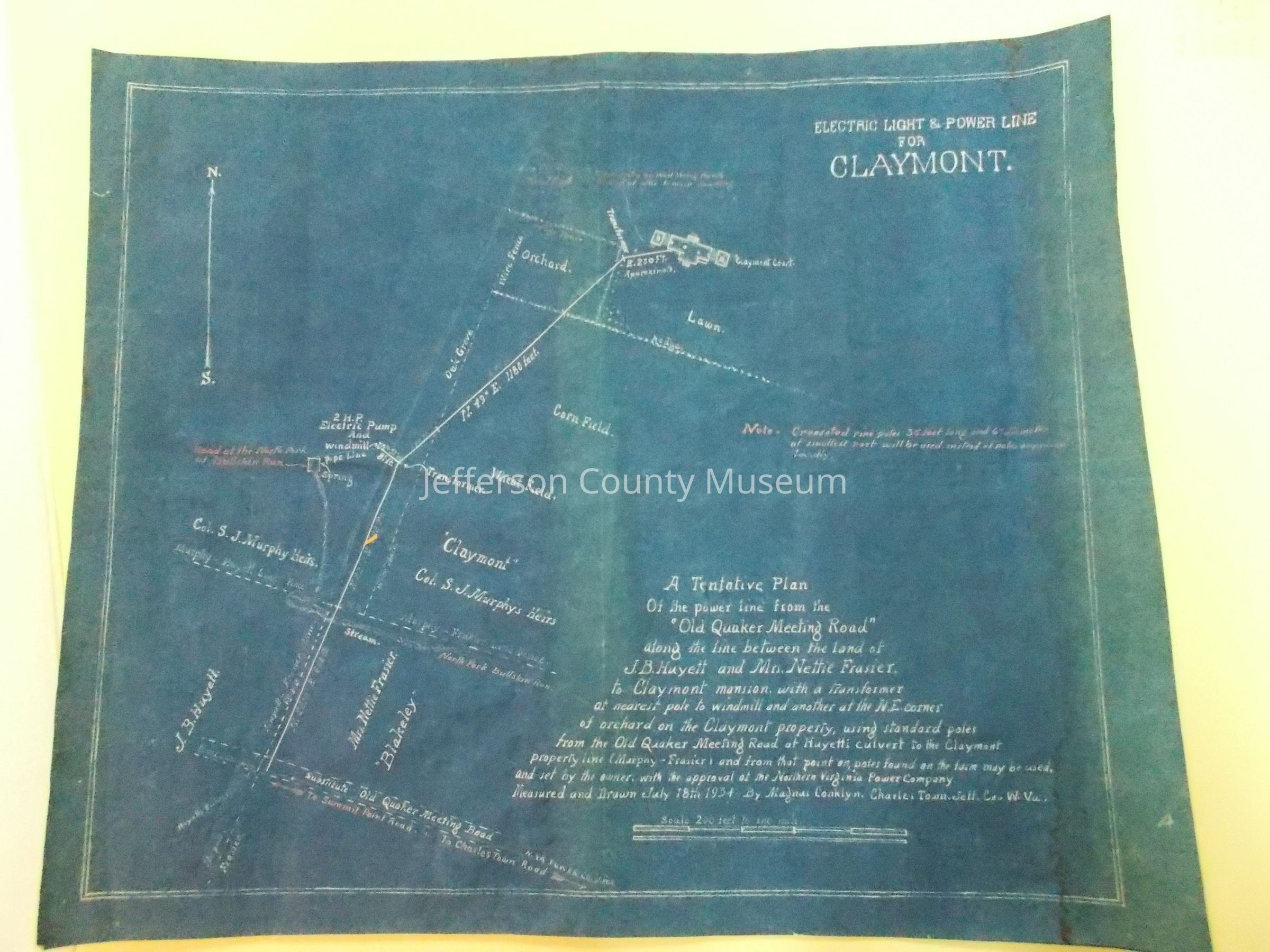 Blueprint map for the Northern Virginia Power Company power line from the "Old Quaker Meeting Road" to Claymont Farm, also showing abutting property belonging to J.B. Huyett and to Mrs. Nettie Frasier. Also shows the head of the North Fork of the Bullskin Run.Acquisition
