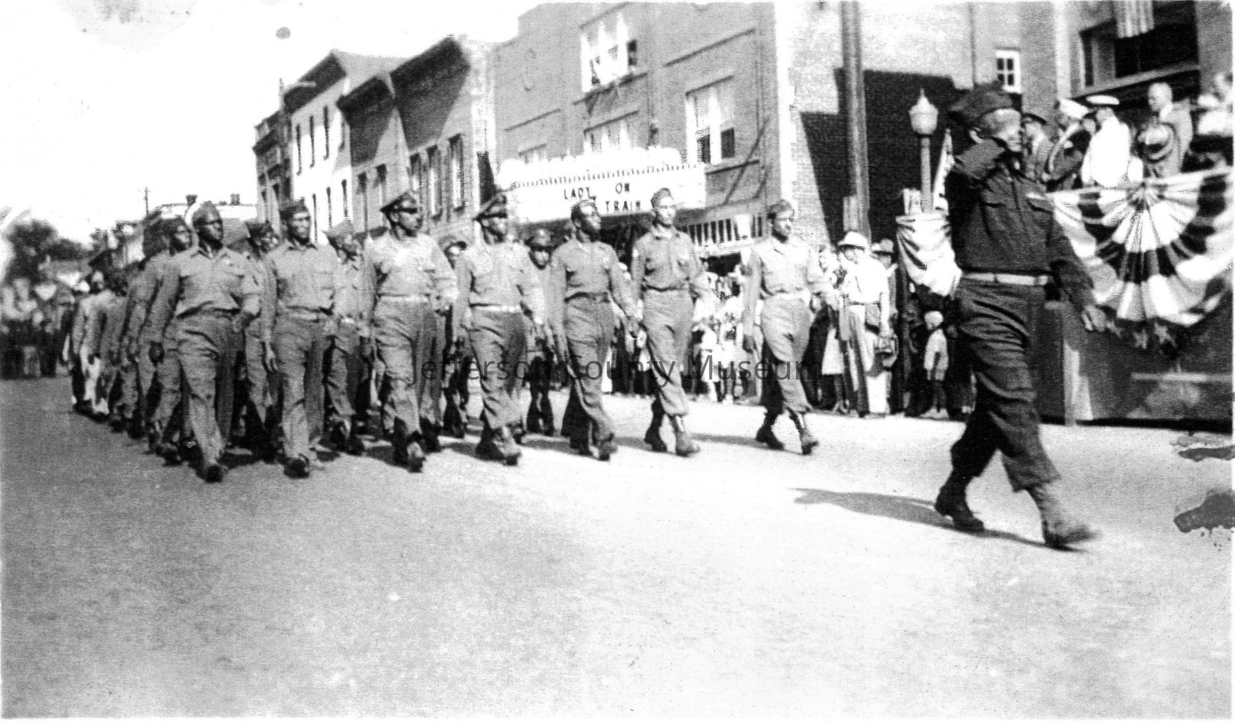 The V-J Day Parade sponsored by Jackson-Perks Post No. 71 American Legion Charles Town, West Virginia, on August 14th, 1946. Shown are African American men who served in World War II on parade marching west on Washington Street. The officer out front is Major Sigismund D. Taylor, U. S. Army. Also identified on the front row are June McDonald (first on left) and Jim Bishop (last on right). Visible in background is the Pitts-Jefferson Theatre marquis advertising the 1945 film "Lady on a Train" starring Deanna Durbin and Ralph Bellamy. The reviewing stand seen in the upper right corner was in front of the new American Legion headquarters which was dedicated following the parade.