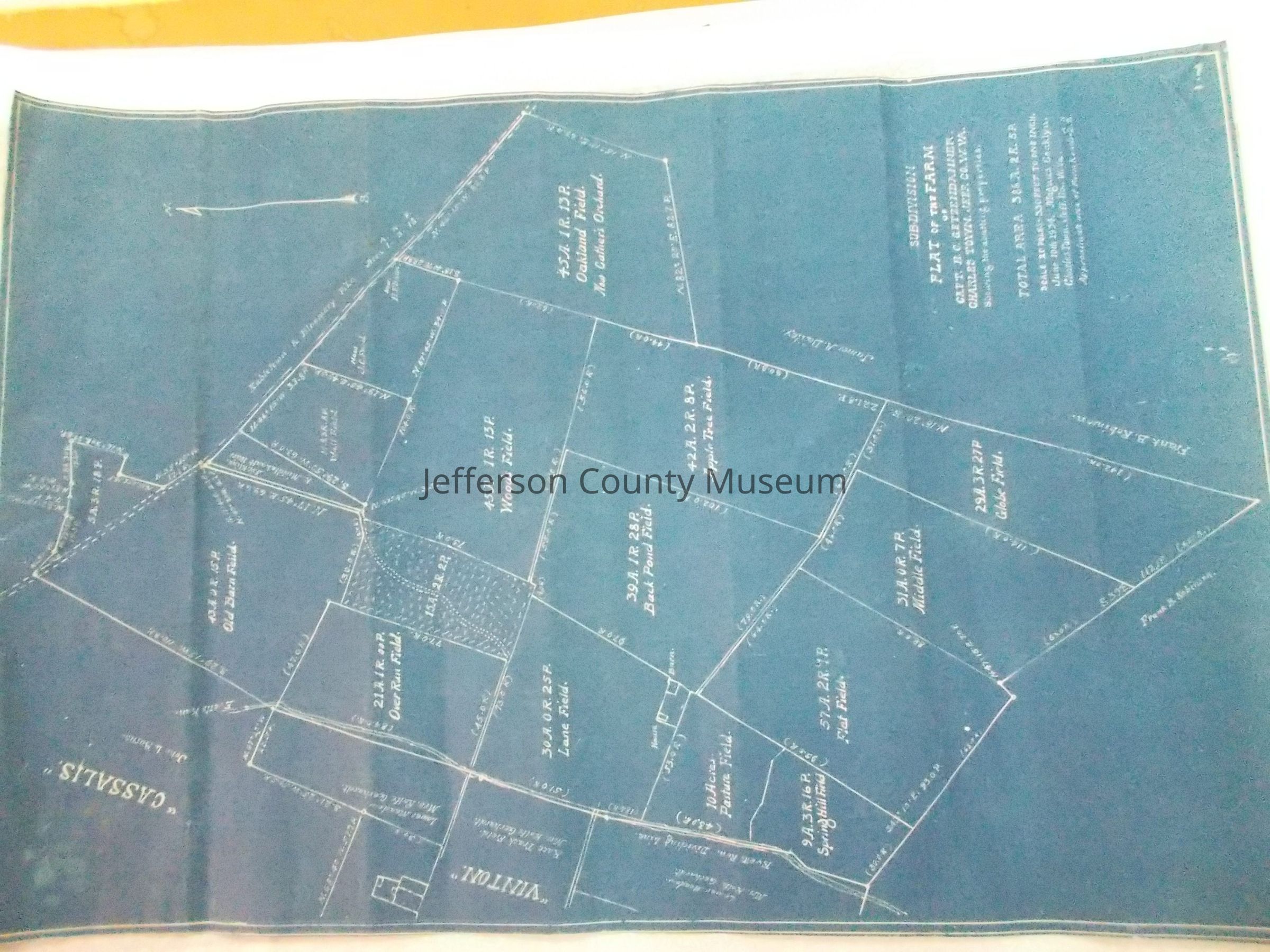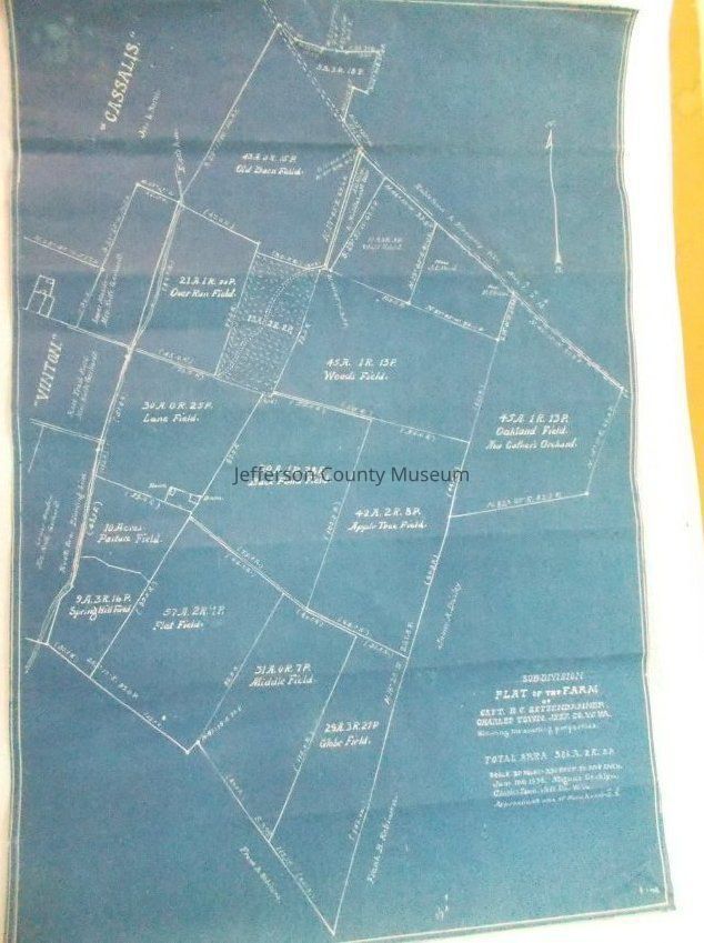 Blueprint of Getzendanner farm and abutting properties, including Vinton Farm, Cassilis, Robinson property and Dailey property. "Kabletown and Bloomery Pike" forms part of northeast boundary; Evetts [sic] Run forms boundary between Getzendanner farm and Vinton Farm.Acquisition