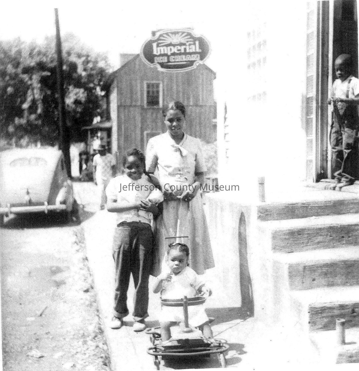 View looking north on South West Street showing five African Americans. Louise Jackson Rogers and her two daughters Sandy and Paula standing on the side walk in front of Taylor's Tavern (Fishermen's Hall). Taylor Downing is standing at the top of the stairs. An unidentified man is standing on the sidewalk just in front of the frame house owned by Russell Roper. Note the "Imperial Ice Cream," sign hanging from the building. Imperial Ice Cream was manufactured in Winchester, Virginia.