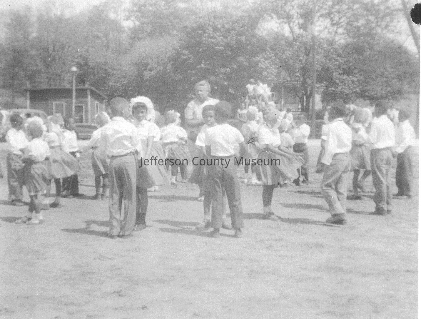 May Day celebration at Eagle Avenue School, an African American school. Probably taken at the second Eagle Avenue School in the 1950s. The school closed at the end of the 1966 school year; on September 24, 1966, it was destroyed by fire.Acquisition