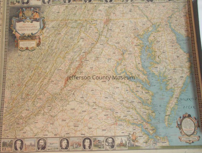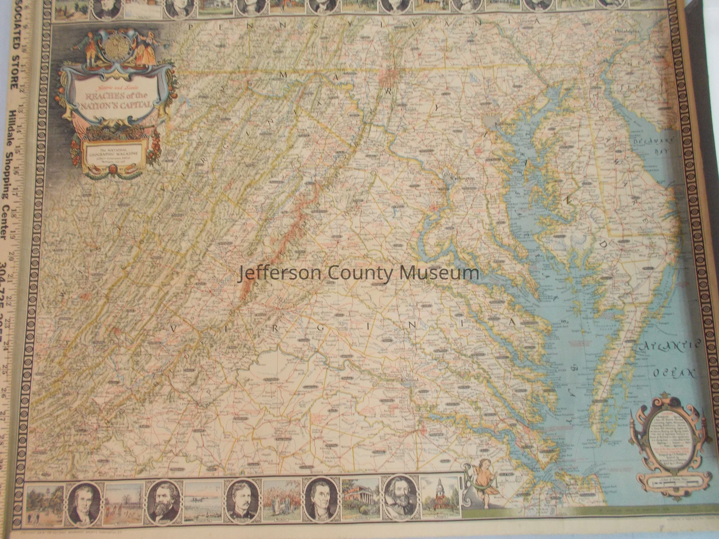 Color map of mid-Atlantic region identifying battlefields, ruins, historic churches, interesting sights, monuments, noteworthy architecture, shrines, etc. Upper and lower borders have depictions of historical figures and places, including Marshall, Monroe, Washington, Jefferson, Chesapeake Bay, Warrenton, Gettysburg, Valley Forge, etc. Designed by L.E. Riddiford; research by W. Chamberlin and A.E. Holdstock. Printed by A. Hoen & Co., Baltimore, MD.Acquisition