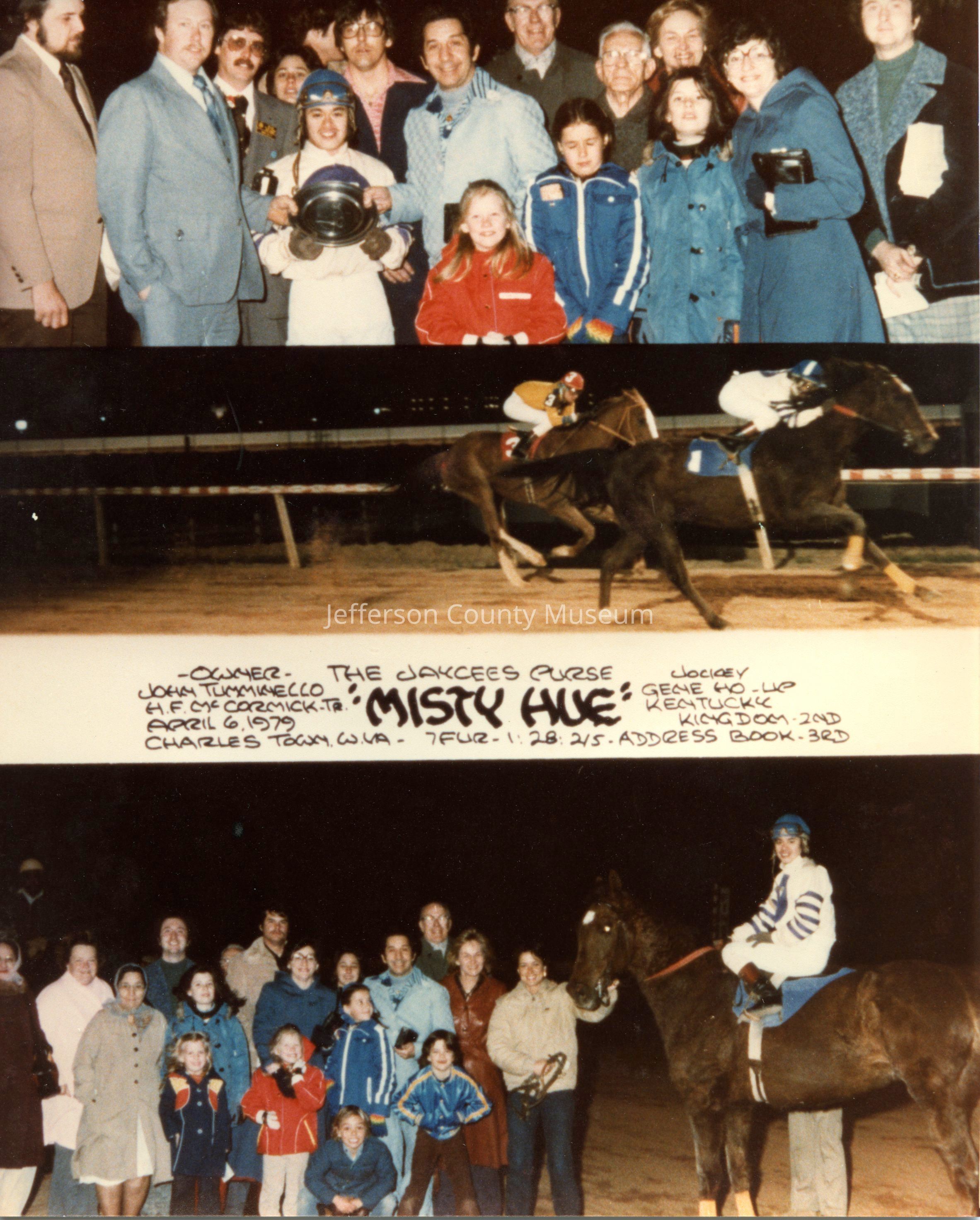 Photo reads: The Jaycees Purse, Misty Hue, Owner John Tumminello, H. F. McCormick-TR, April 6, 1979, Charles Town, W. VA, Jockey Gene Ho-Up, Kentucky Kingdon 2nd, Address Book 3rd, 7 Fur, 1:28: 2/5Acquisition