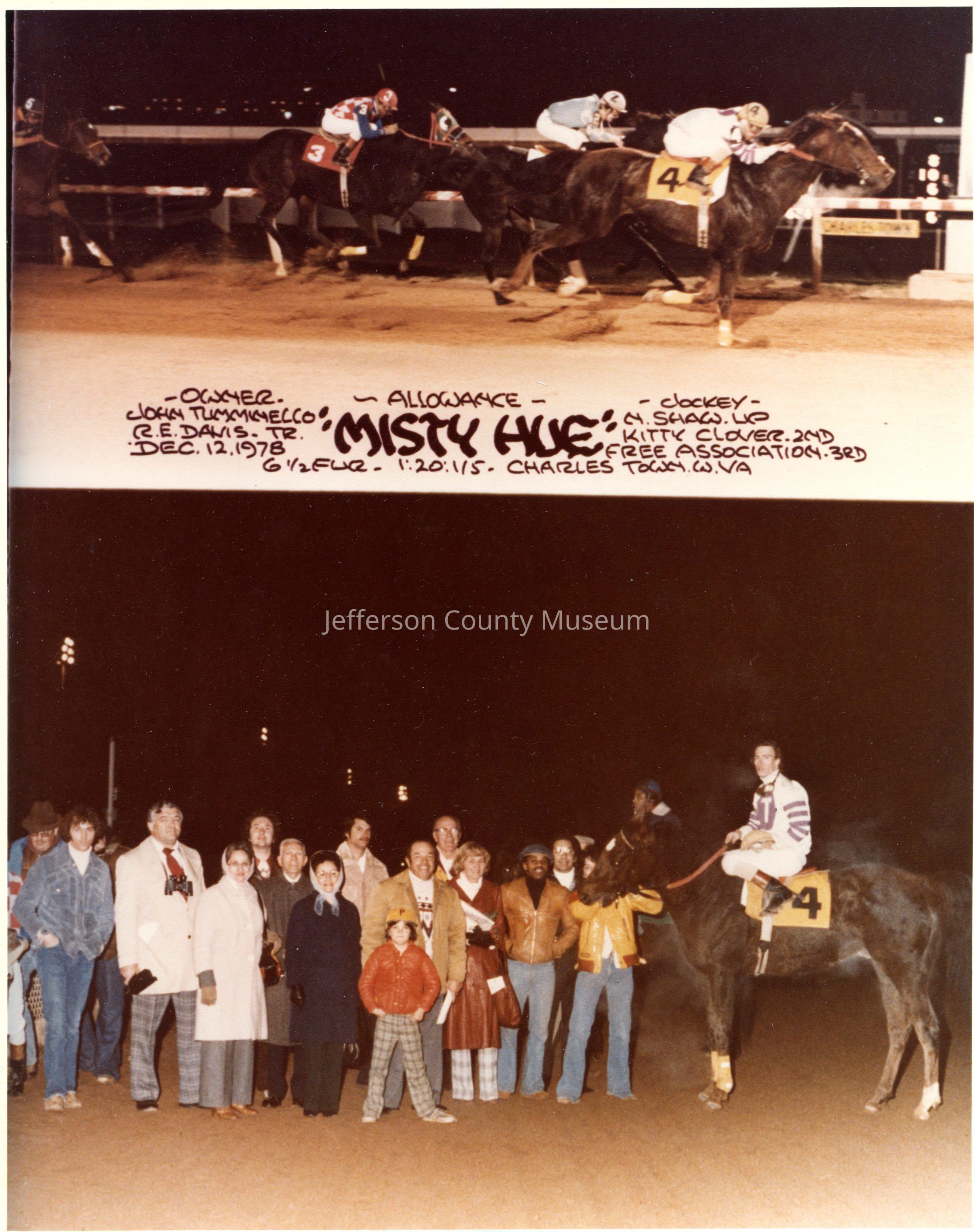 Photo reads: Allowance, Misty Hue, Owner-John Tumminello, R. E. Davis-TR, December 12, 1978, Jockey-N. Shaw.Up, Kitty Clover-2nd, Free Association-3rd, 6 1/2 Fur, 1:20:1/5, Charles Town, W. VA.Acquisition