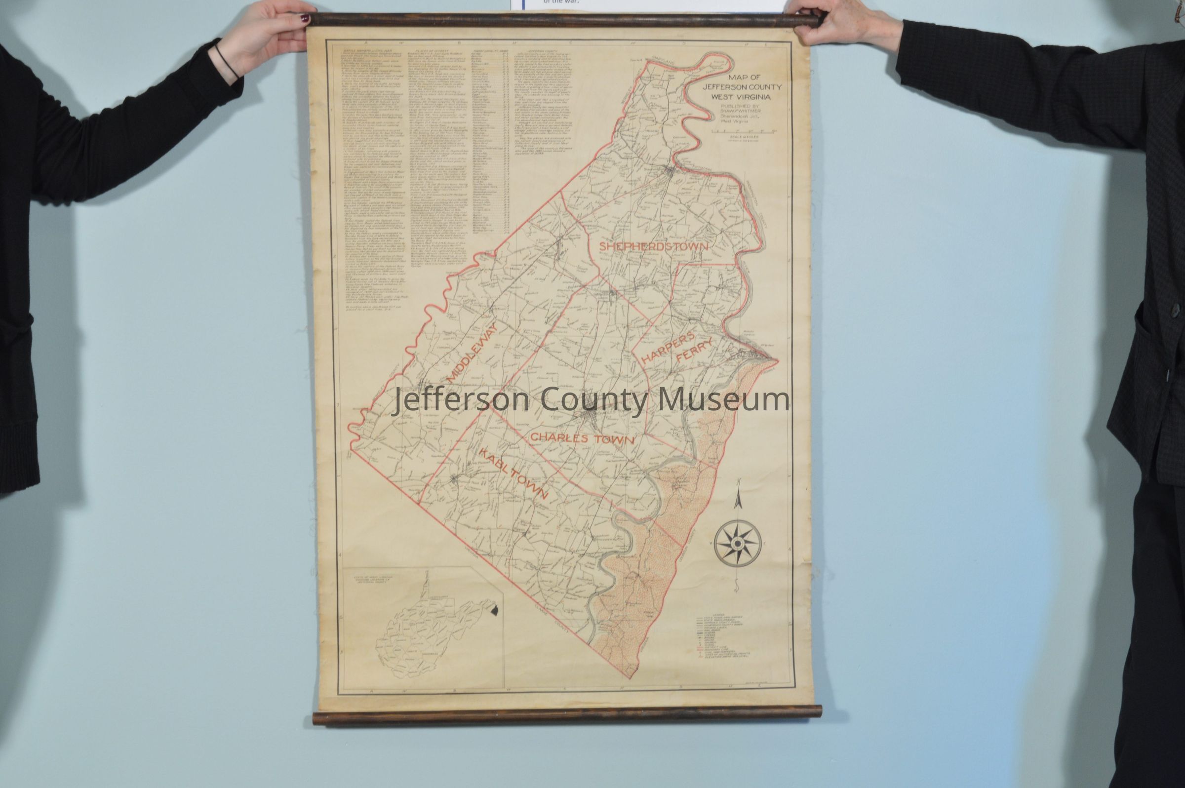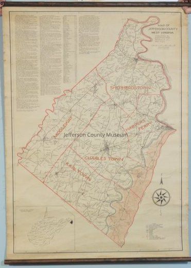 Map of Jefferson County, West Virginia, drawn by W. C. Whitmer. Shows the magisterial districts of Shepherdstown, Middleway, Kabletown (misspelled as Kabltown), Charles Town, and Harpers Ferry. Also shows farms and their names. In the upper left corner are the following lists: Battle Markers of the Civil War; Places of Interest; and Towns & Locality Names. Population taken from the 1920 census. Wooden rollers at each end; dimensions do not include the wooden rollers.