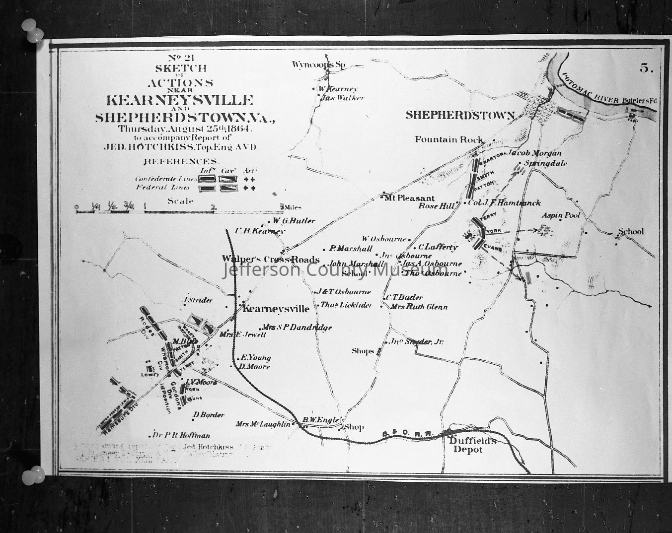 Sketch of actions near Kearneysville and Shepherdstown, Va., Thursday, August 25th, 1864. Copy of Plate 82, map number 5 from the Atlas to Accompany the Official Records of the Union and Confederate Armies. The original map was drawn by Major Jedediah Hotchkiss for General Jubal A. Early during the 1864 Shenandoah Valley Campaign. Map shows action principally around Kearneysville on August 25th. Copy made for Francis Printz whose home Aspin [sic] Pool is shown on the map.Acquisition