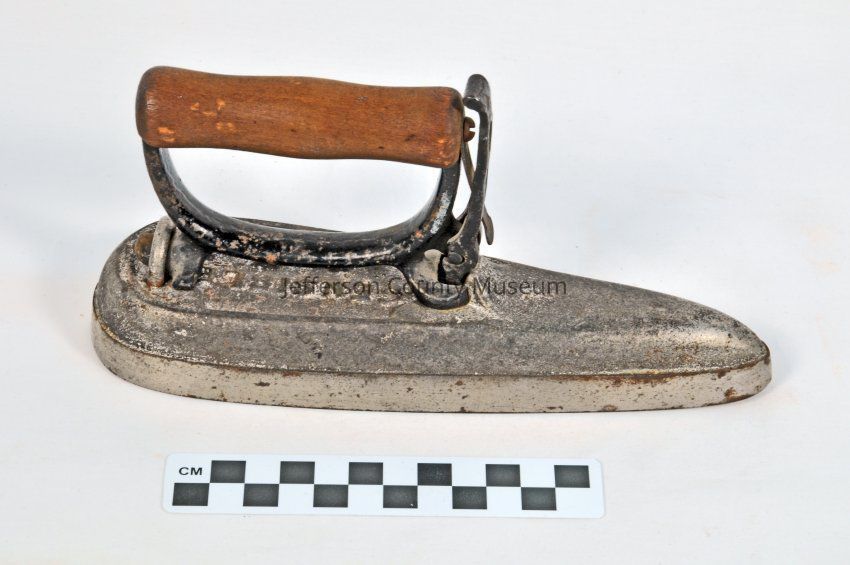 Tear-drop-shaped iron with wooden handle. Handle has a lever to make it removable. Embossed on top of iron "SENSIBLE No. 5".Acquisition
