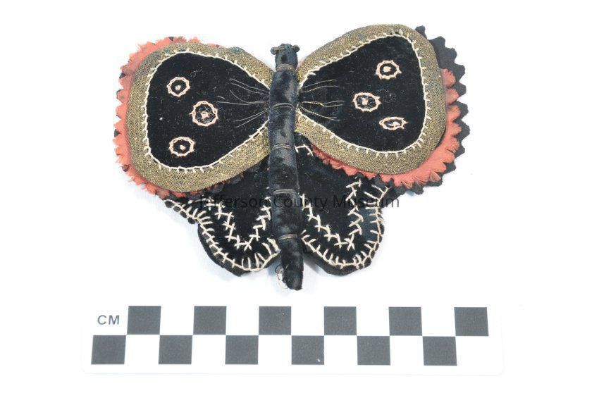 Black velvet butterfly-shaped pen wiper. Has three pink circles stitched on each wing.