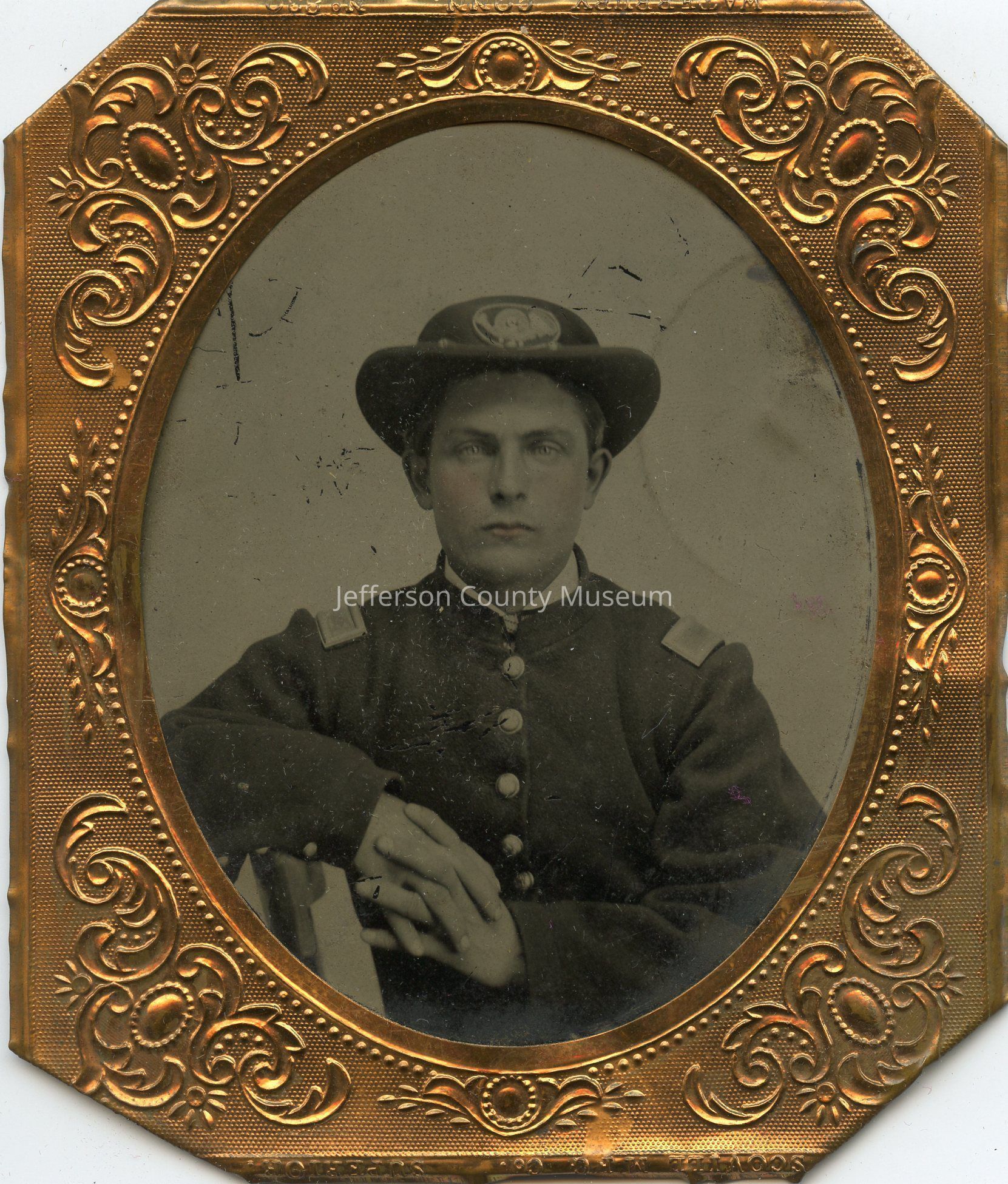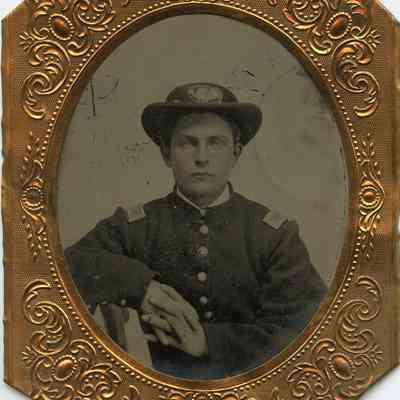 Union officer with "Hunting Horn" infantry insignia on hat. He is seated with right arm on a table and hands clasped together. Tintype is resting on one piece of a broken case for tintypes. Red velvet has faded around tintype but is red underneath. Surrounded by embossed gold colored metal. At bottom "Scovill MFG Co. SUPERIOR".