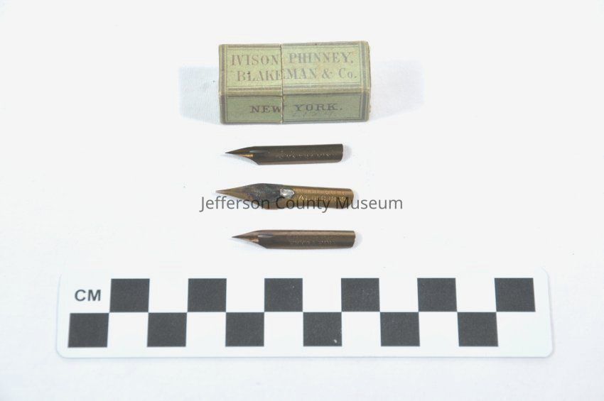Three brass pen nibs in a green box. On one side "SCHOOL PEN." On another side in script "Spencerian". On another side "NEW YORK." On fourth side "IVISON PHINNEY, BLAKEMAN & Co.".