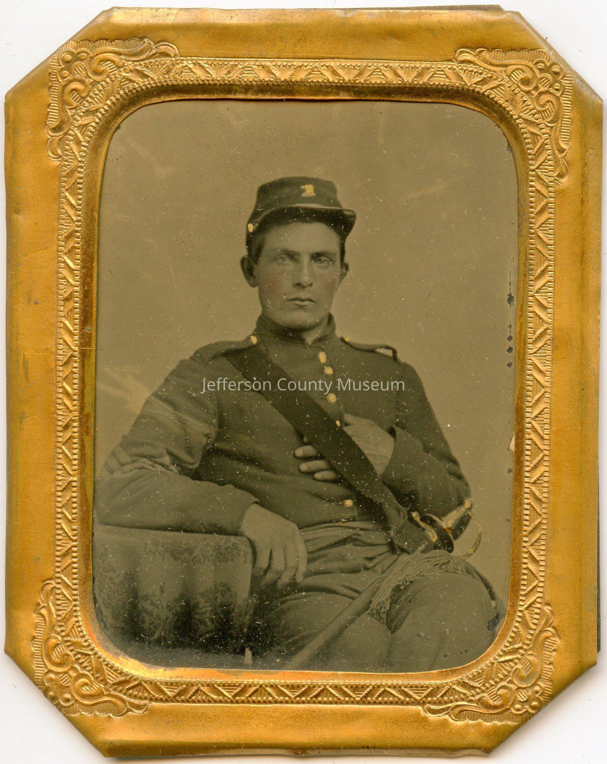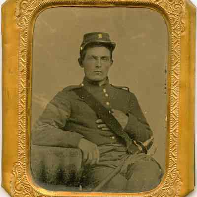 Probably Union soldier wearing kepi. Shoulder belt through epaulet on right shoulder, left hand behind belt, sword across lap. Embossed gold metal surrounds.