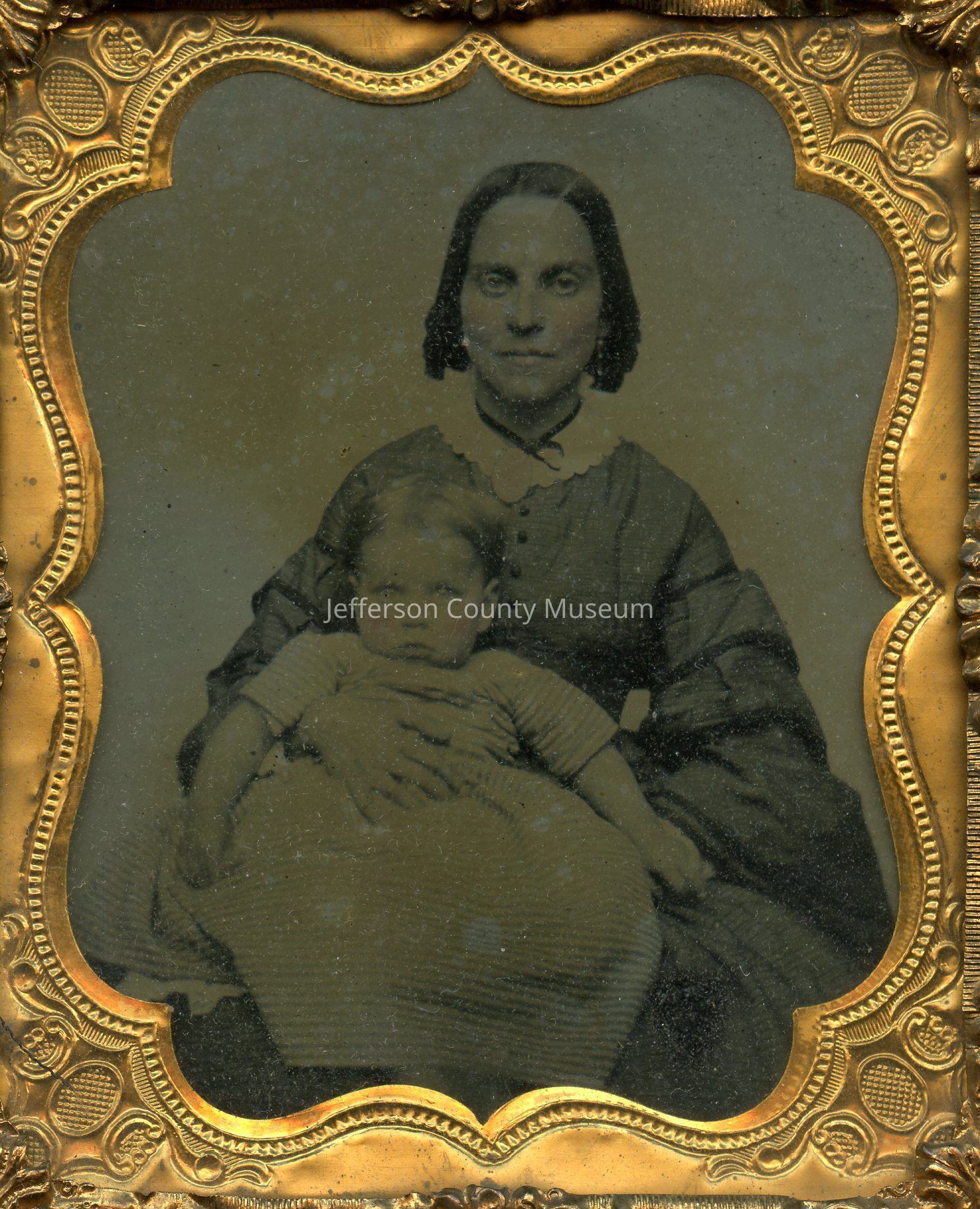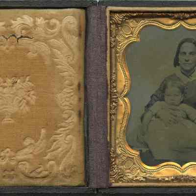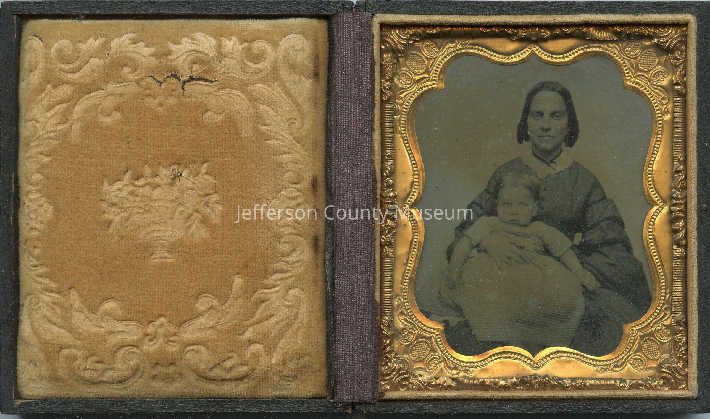 Woman in long dress with white collar holding baby with long dress. Embossed gold metal surrounds tintype. In case with tan colored velvet on opposite side. Hook for closure missing.