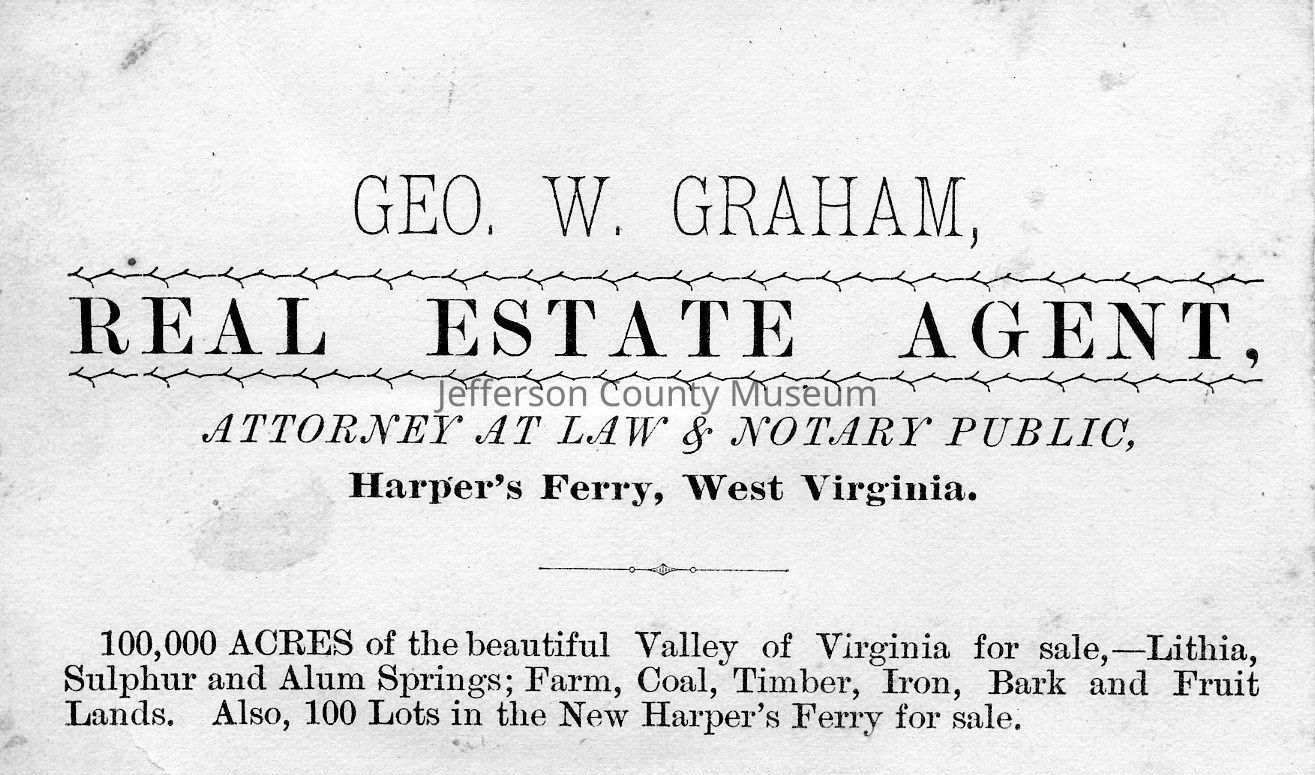 Card reads: Geo. W. Graham, Real Estate Agent, Attorney at Law & Notary Public, Harper's Ferry, West Virginia. 100,000 acres of the beautiful Valley of Virginia for sale, -Lithia, Sulphur and Alum Springs; Farm, Coal, Timber, Iron, Bark and Fruit Lands. Also, 100 Lots in the New Harper's Ferry for sale.Acquisition