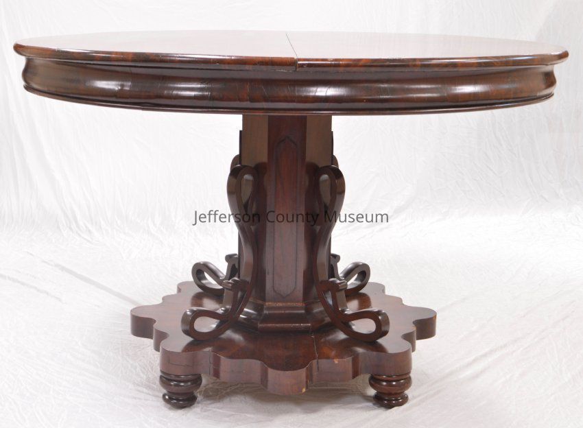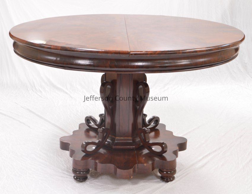Mid-19th century round-topped table, round base with scalloped design. Pillar support has four free-standing carved scrolls attached to pillar. Flame mahogany over secondary wood.Acquisition