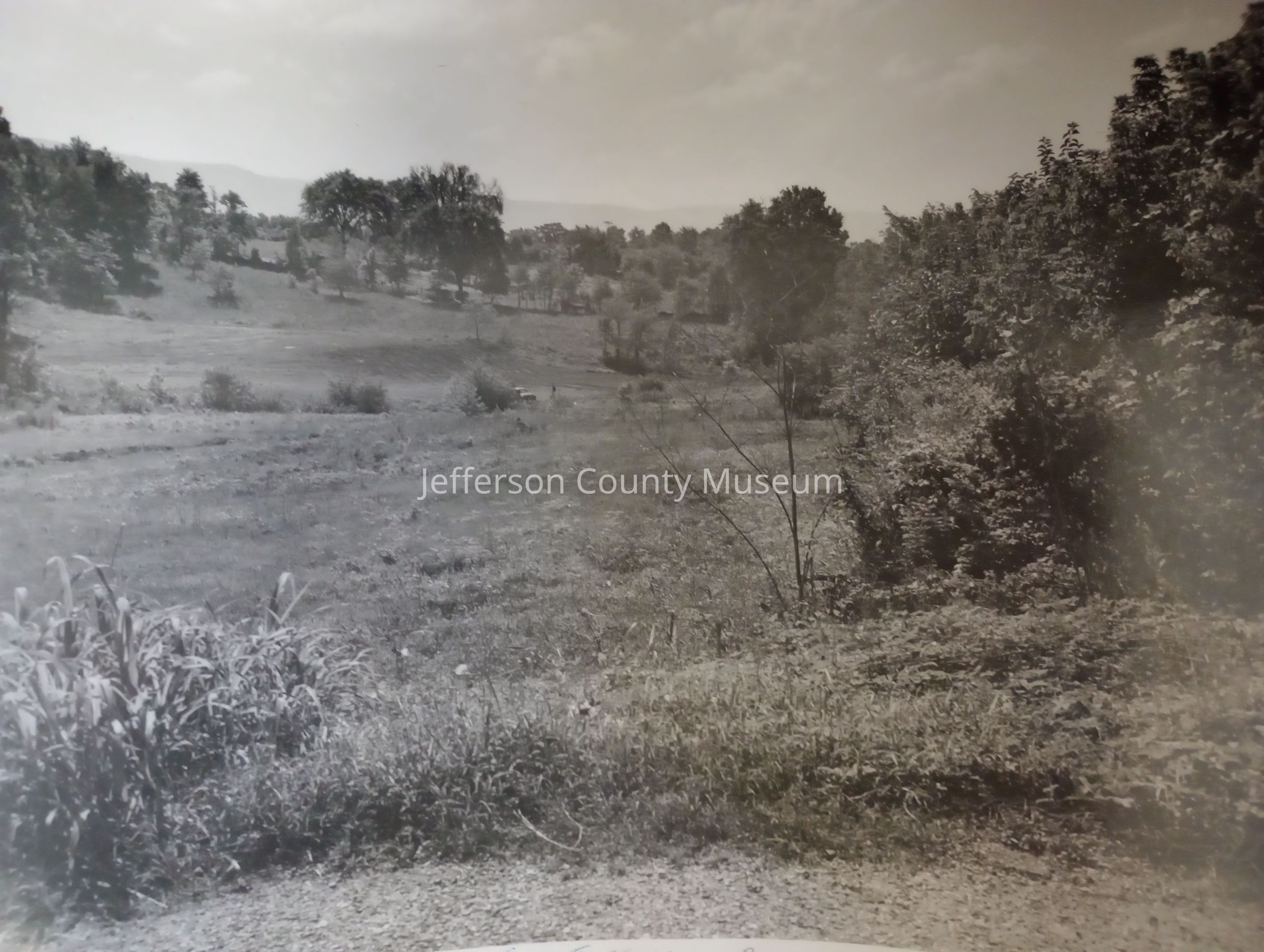 Black and white photo of a field with trees and mountains in the background. In the middle of the photo is a car parked with an individual walking toward it. At the bottom is written in pen "Future Site Jeff Mem. Park 1948".Acquisition
