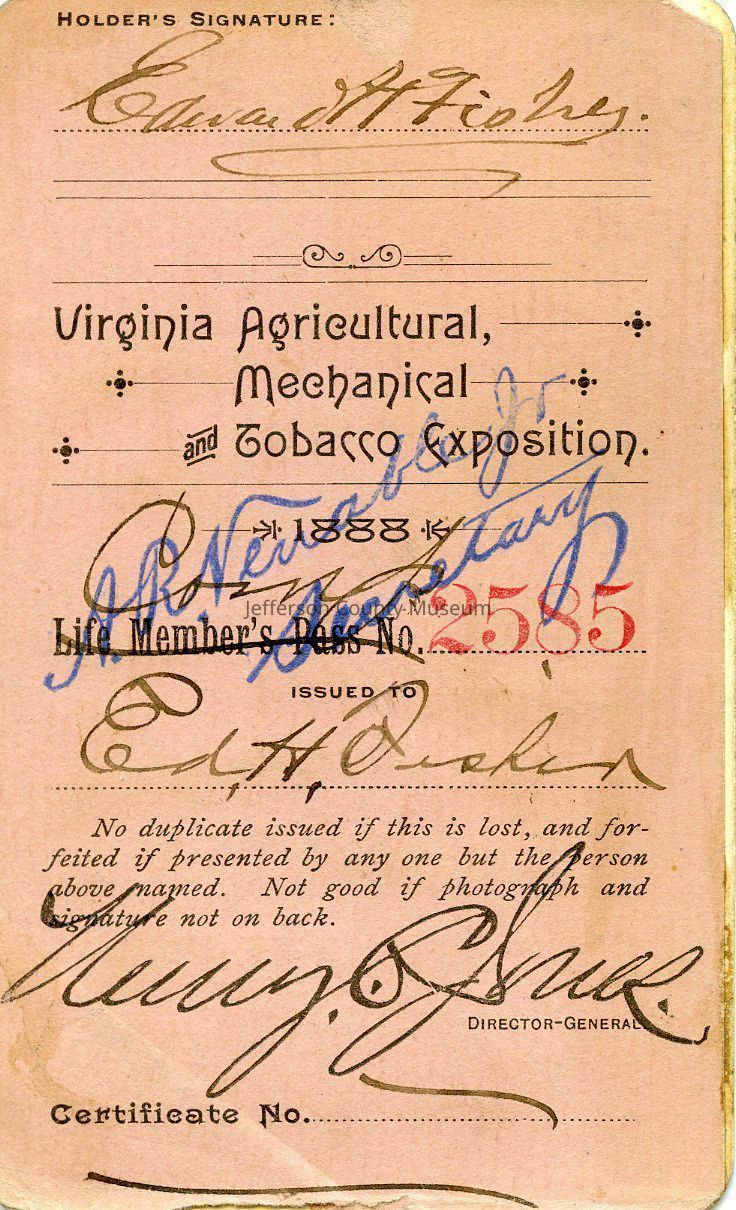 Back of carte de visite reads in part: Edward H. Fisher, Virginia Agricultural, Mechanical and Tobacco Exposition, Life member's pass no. 2585Acquisition