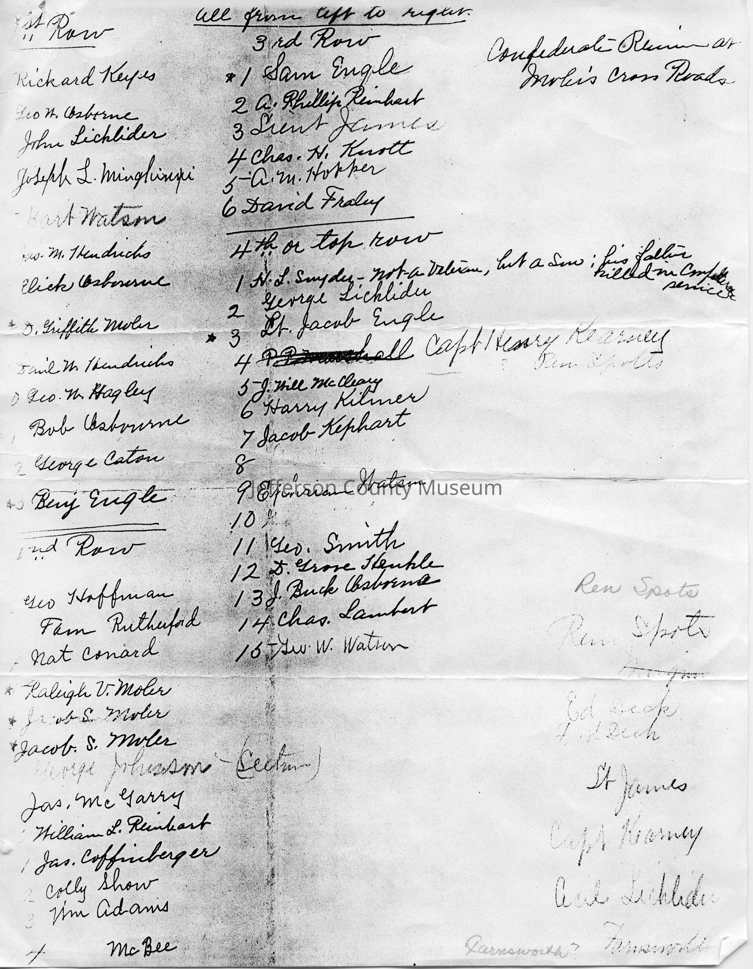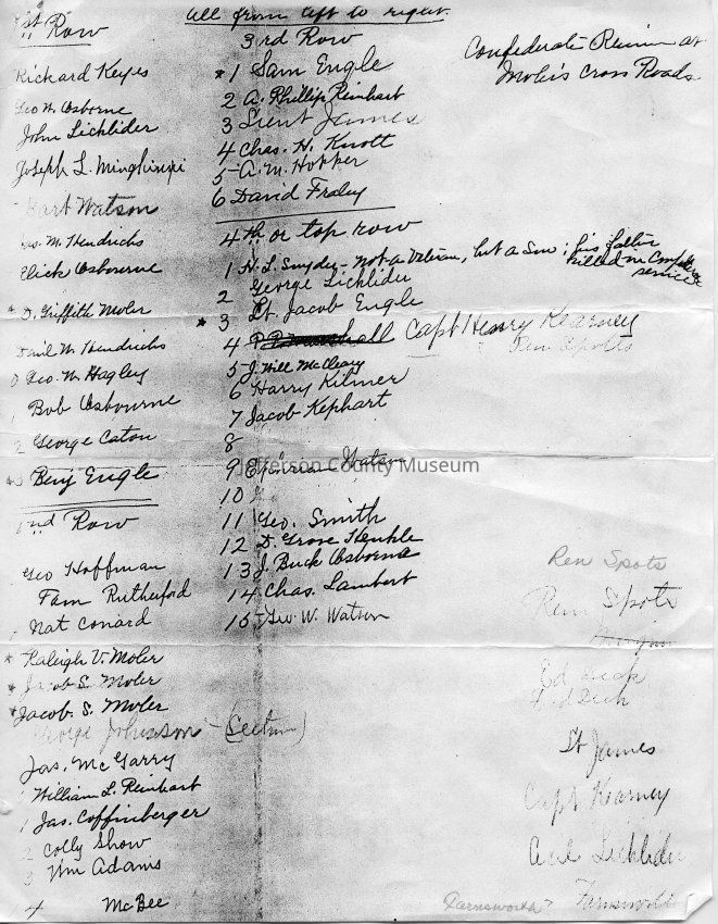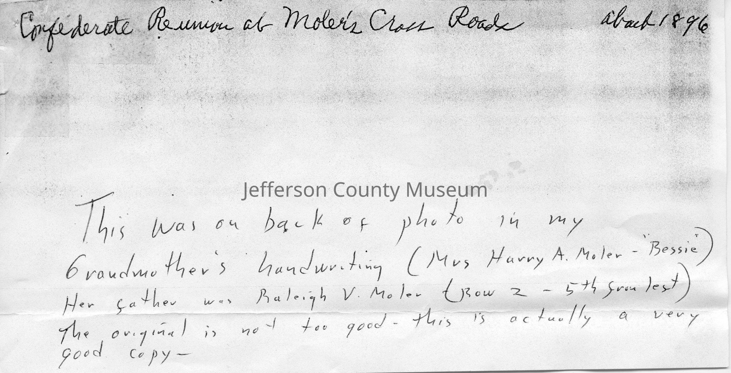 Accompanying material reads: " This was on back of photo in my Grandmother's handwriting (Mrs. Harry A. Moler - "Bessie"), Her father was Raleigh V. Moler (Row 2 - 5th from left). The original is not too good - this is actually a very good copy- "Acquisition