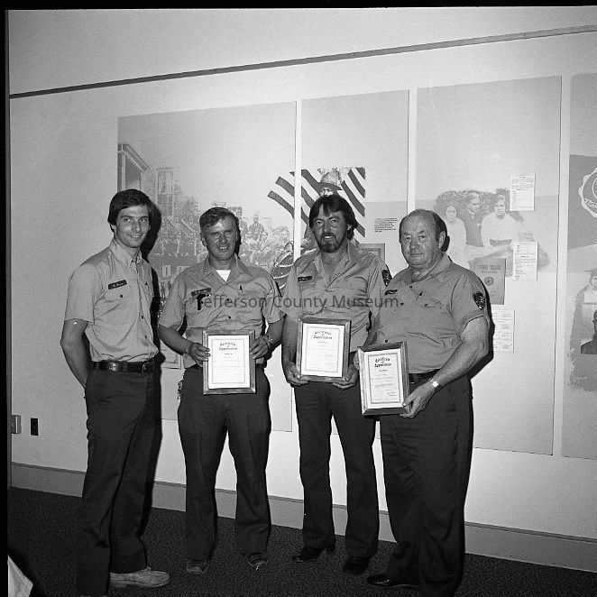 Awards presentations Harpers Ferry National Historical Park. Unknown awards presented to three (3) unidentified male park maintenance employees and Philip H. Perks, Jr. (right). Presentations made in the Storer College room in Wirth Hall at Mather Training Center.