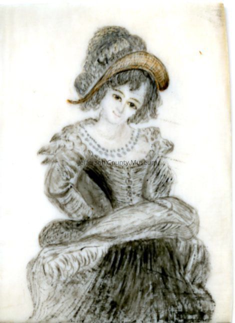 Scrimshaw on thin piece of bone of woman in feathered hat and 19th century dress wearing a double stranded necklace.Acquisition