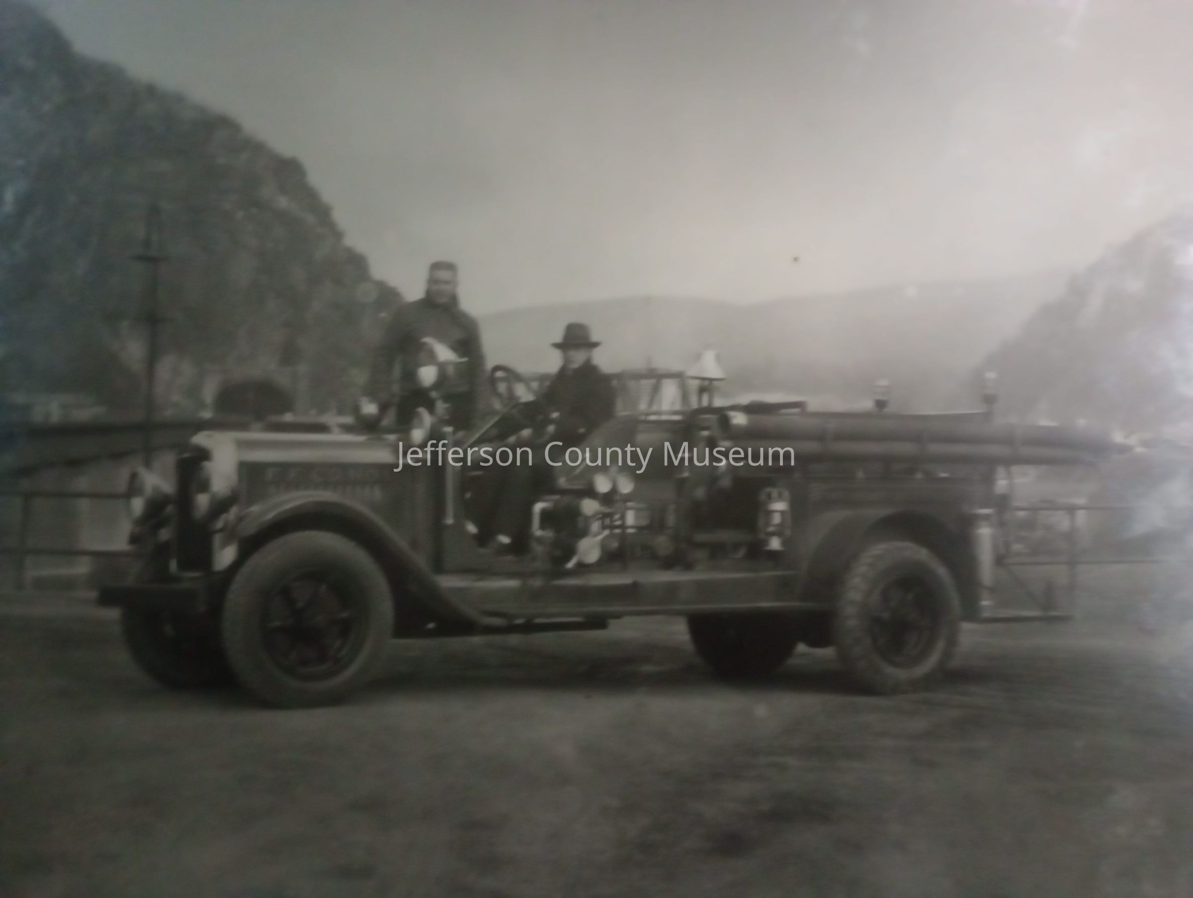 Black and white photograph of the Friendship Fire Company No. 1's engine at the Point in Harpers Ferry. Two men, one standing and one seated, are on top of the engine. Railroad tunnel and Mennen's advertisement are visible on the banks of the Potomac, and cars can be seen at far right driving along the Shenandoah.Photograph Details