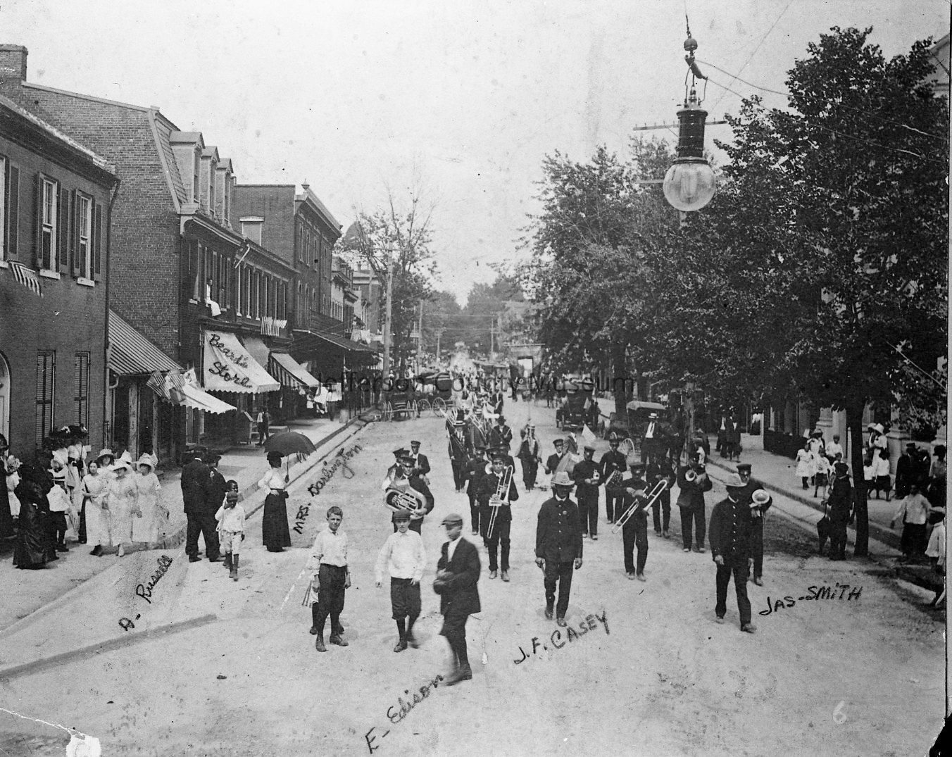 Redmen Parade, c.1910s. View is looking east on Washington Street from the intersection with Lawrence Street. [copied from old photograph]