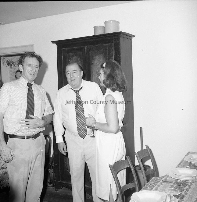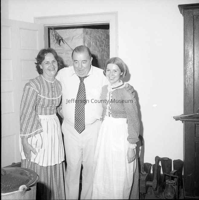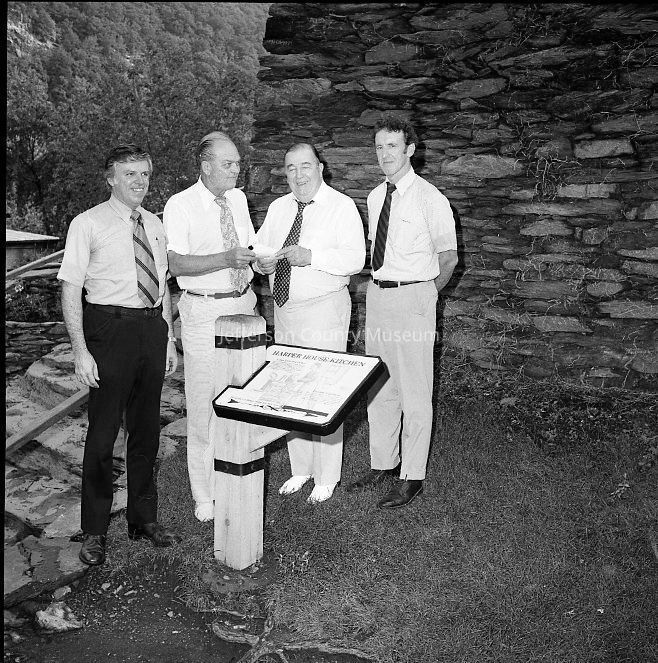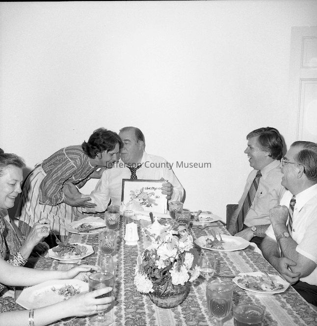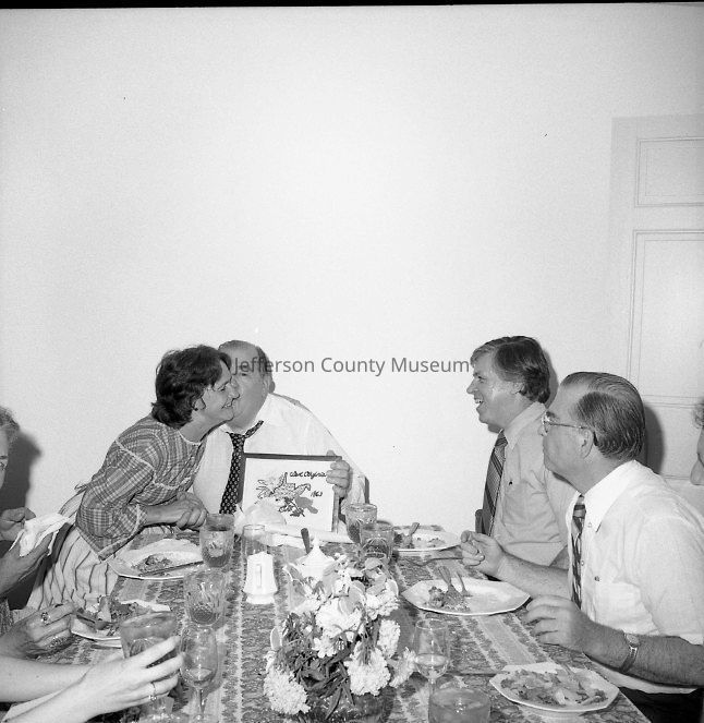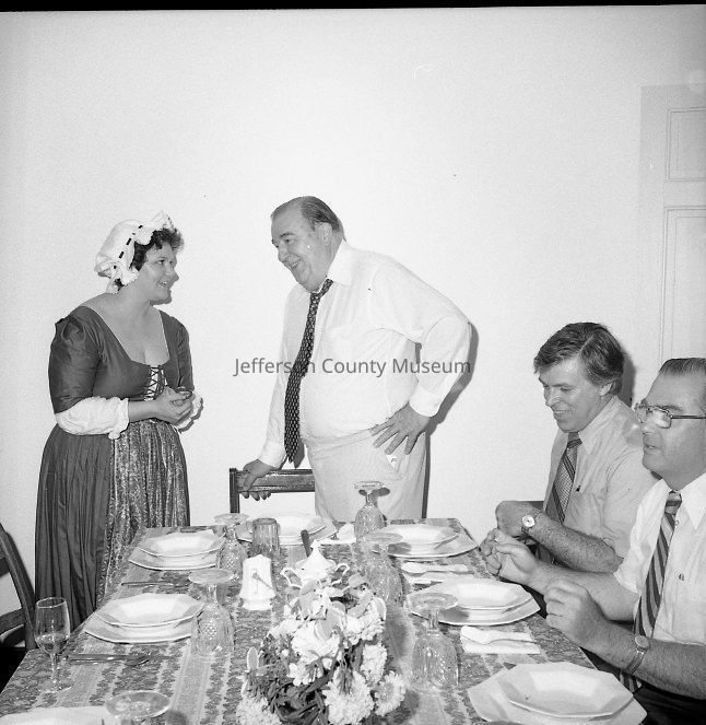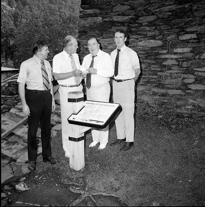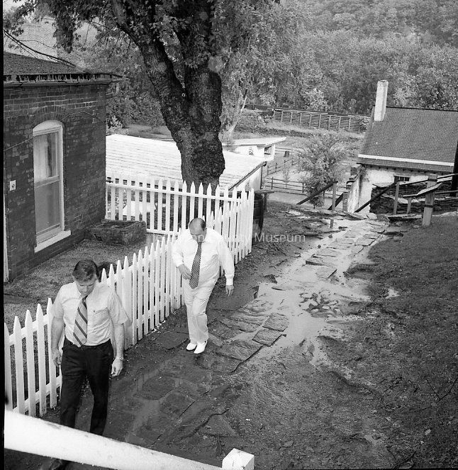 US Senator Jennings Randolph at Harper House to present check to Mayor Gilbert Perry of Harpers Ferry for the Park Service's contribution to the new water and sewer system of Harper Ferry. l to r: Manus "Jack" Fish, Director National Capital Region, NPS; Mayor Gilbert Perry; US Senator Jennings Randolph; Martin R. Conway, Superintendent, Harpers Ferry NHP.Acquisition